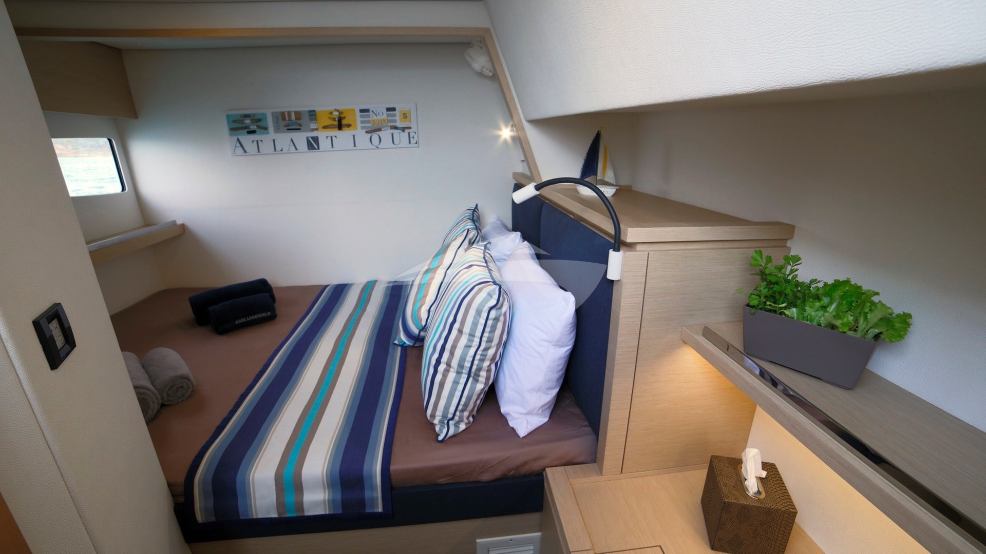 With amazing space both indoors and outdoors, she is designed in order to give you a comfortable and luxurious environment. The yacht can accommodate 12 persons in her cockpit table, allowing her guests to enjoy dinning outdoors all together. Further, she has a foredeck salon and an upper deck salon both protected with sun awnings, but also numerous sunbeds to enjoy the sun when desired.