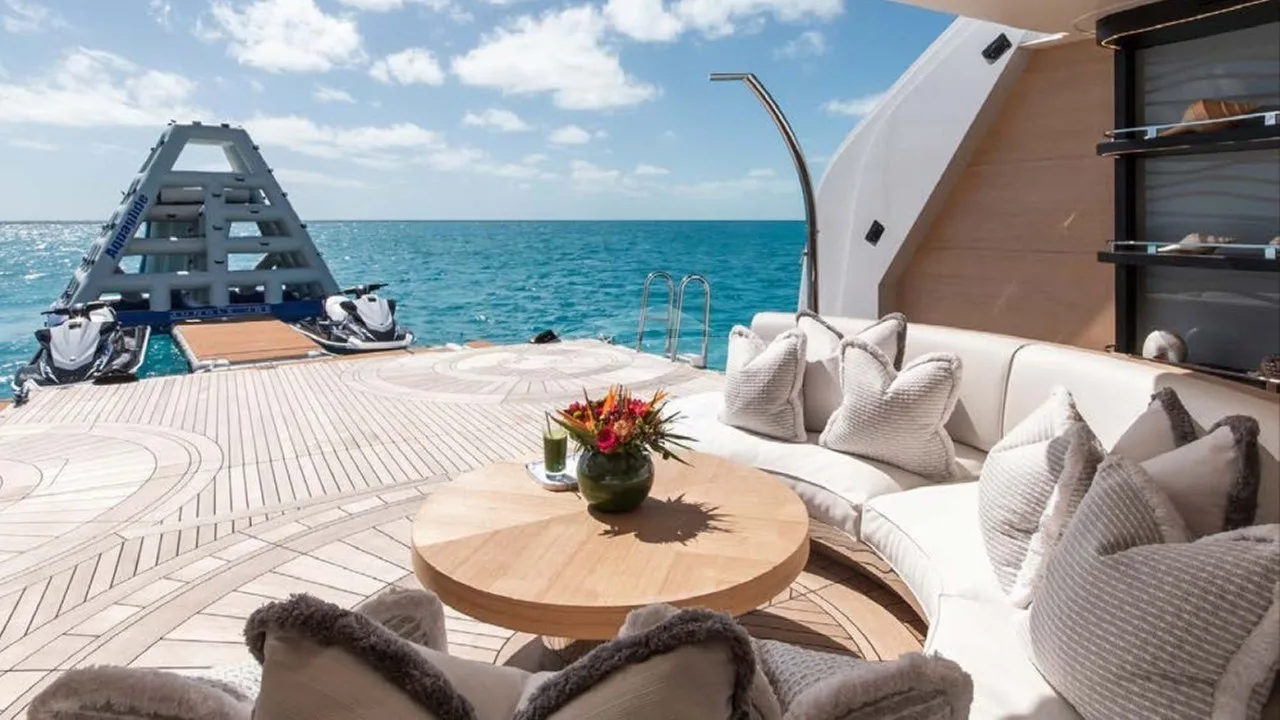 The exterior spaces are designed to maximise guest enjoyability, with copious comfortable seating options, spacious deck spaces offering both shade and sun, exceptionally easy access to the water and watertoys with a stunning beach club. The sun deck pool, surrounded by sun beds for ultimate relaxation, is a highlight for all guests. The sun deck also includes a bar, meaning a cocktail is easily delivered to guests enjoying the sun set, as well as a shaded dining area to enjoy an extravagant lunch with respite from the sun's rays. The bridge deck aft is complete with a large dining table, surrounded by views of the paradise around you, and with space for all your guests to enjoy meals together. The beach club offers an exceptional crescent couch to sit back, relax, and take in the action while those more adventurous dive in the blue water, take the jetskis for a spin, climb on the floating inflatable tower, and make the most of the watertoys at their disposal. If you're not exhausted from watersports and a day spent in the sun, there is also a gym in the beach club, complete with a treadmill, elliptical, and weights.