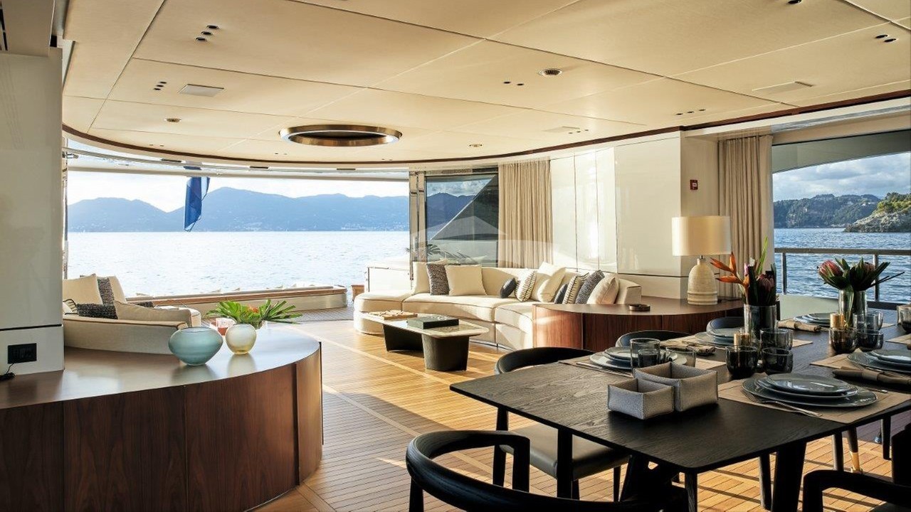When shade is needed, guests can saunter beyond the flush sliding doors to the main deck salon, to enjoy unobstructed views of the sea and kick-back on the crisp white sofas that sit symmetrically, while one of the attentive crew brings them a cooling drink. Forward of this lounge is a formal dining area with two large wine cellars; the whole space is bathed in natural light, thanks to floor-length windows.