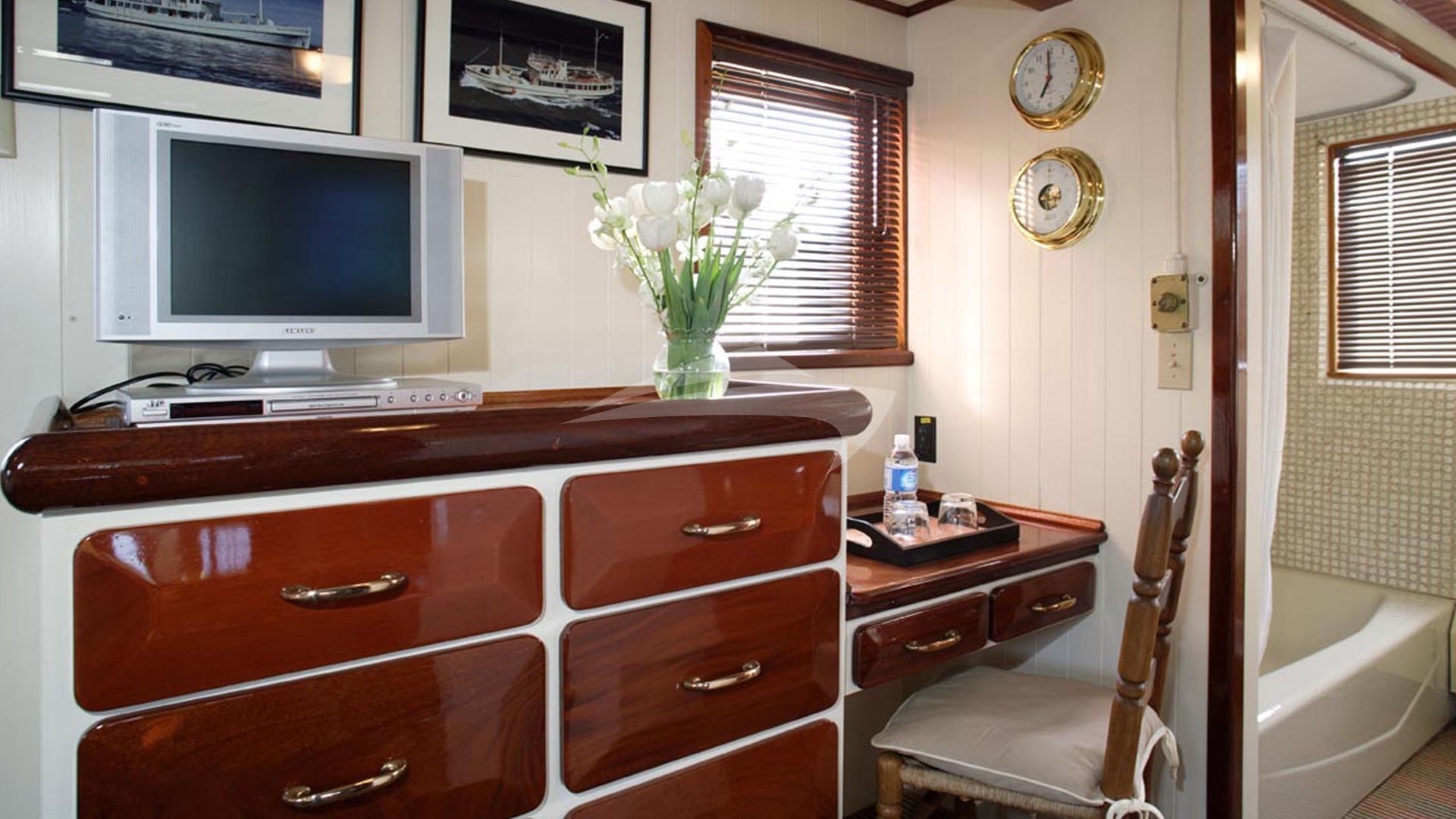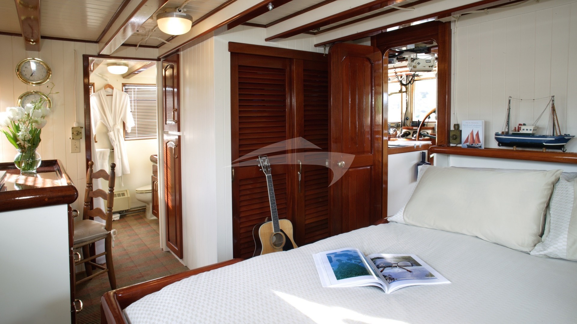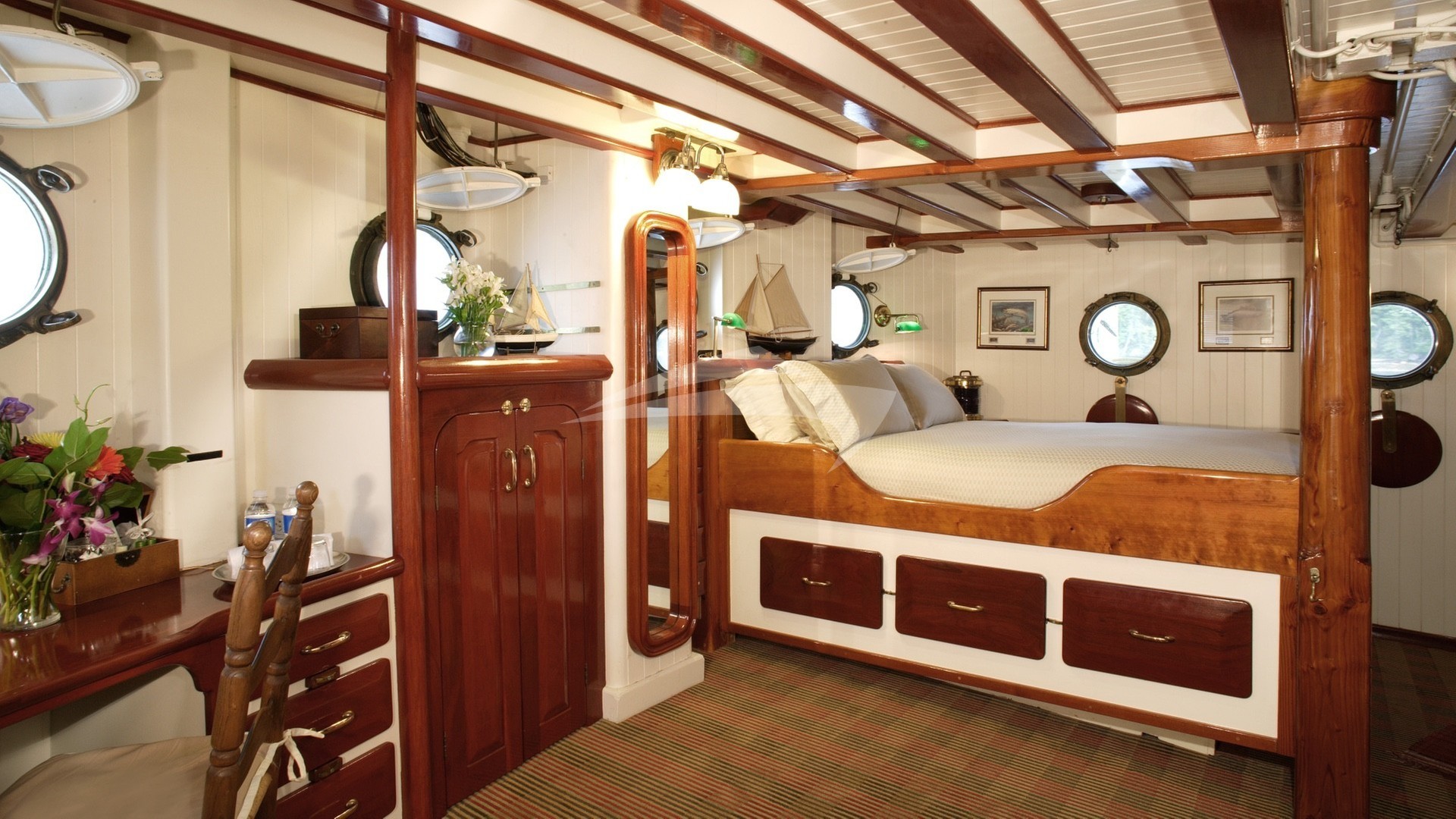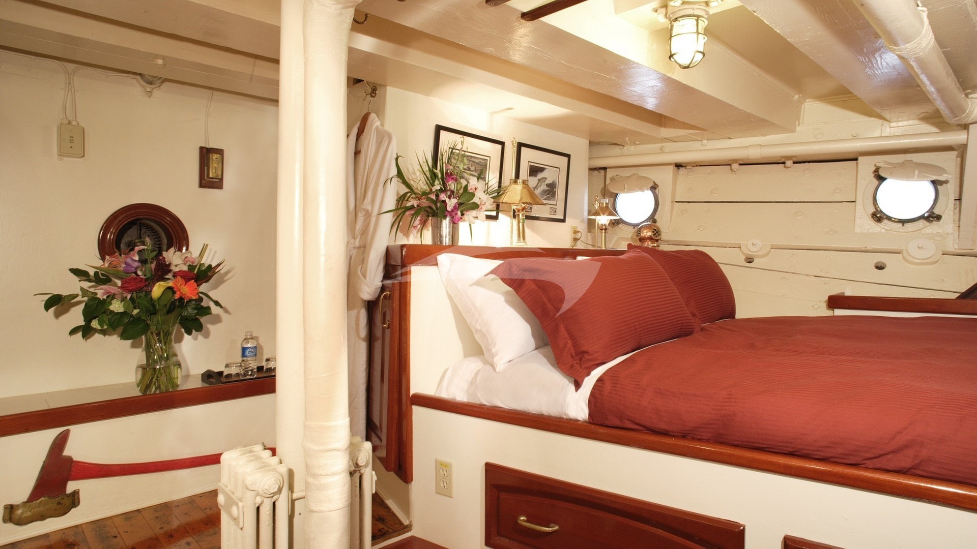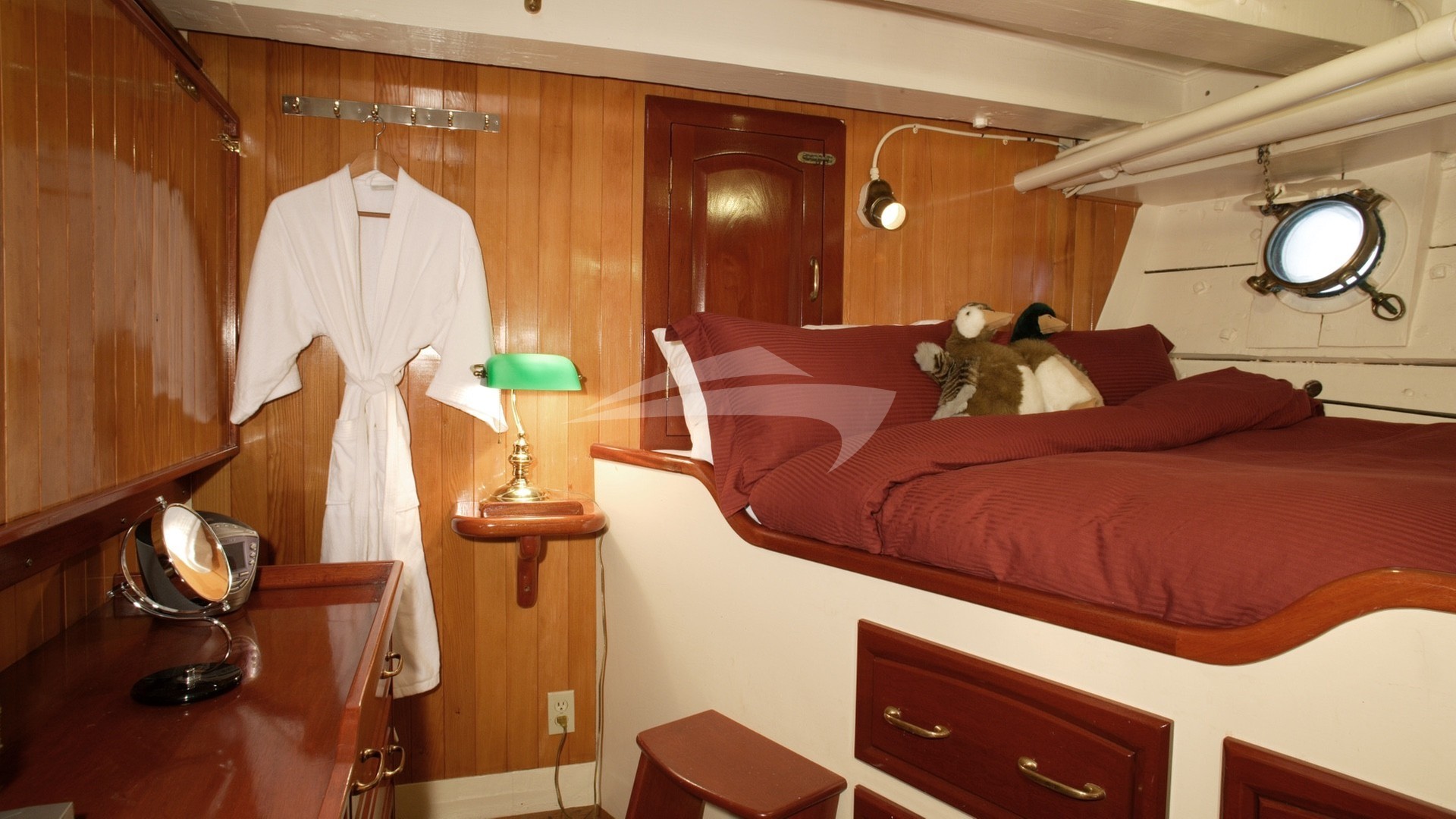 Sleeps 2-3. DOUBLE bed on one side. Drop down Pullman SINGLE bed on the other side. Two opening portholes. Private bathroom across the hall, with shower.