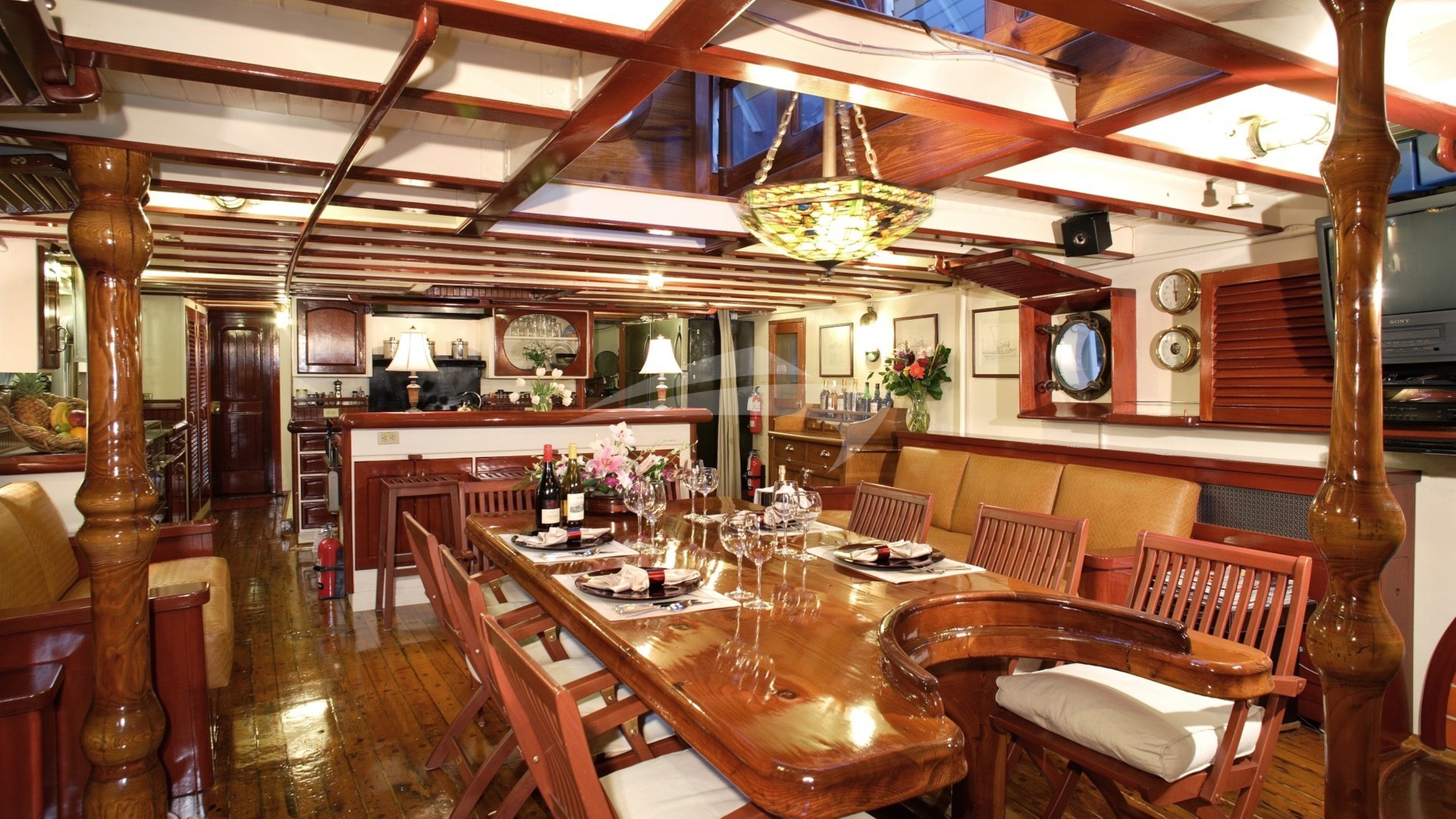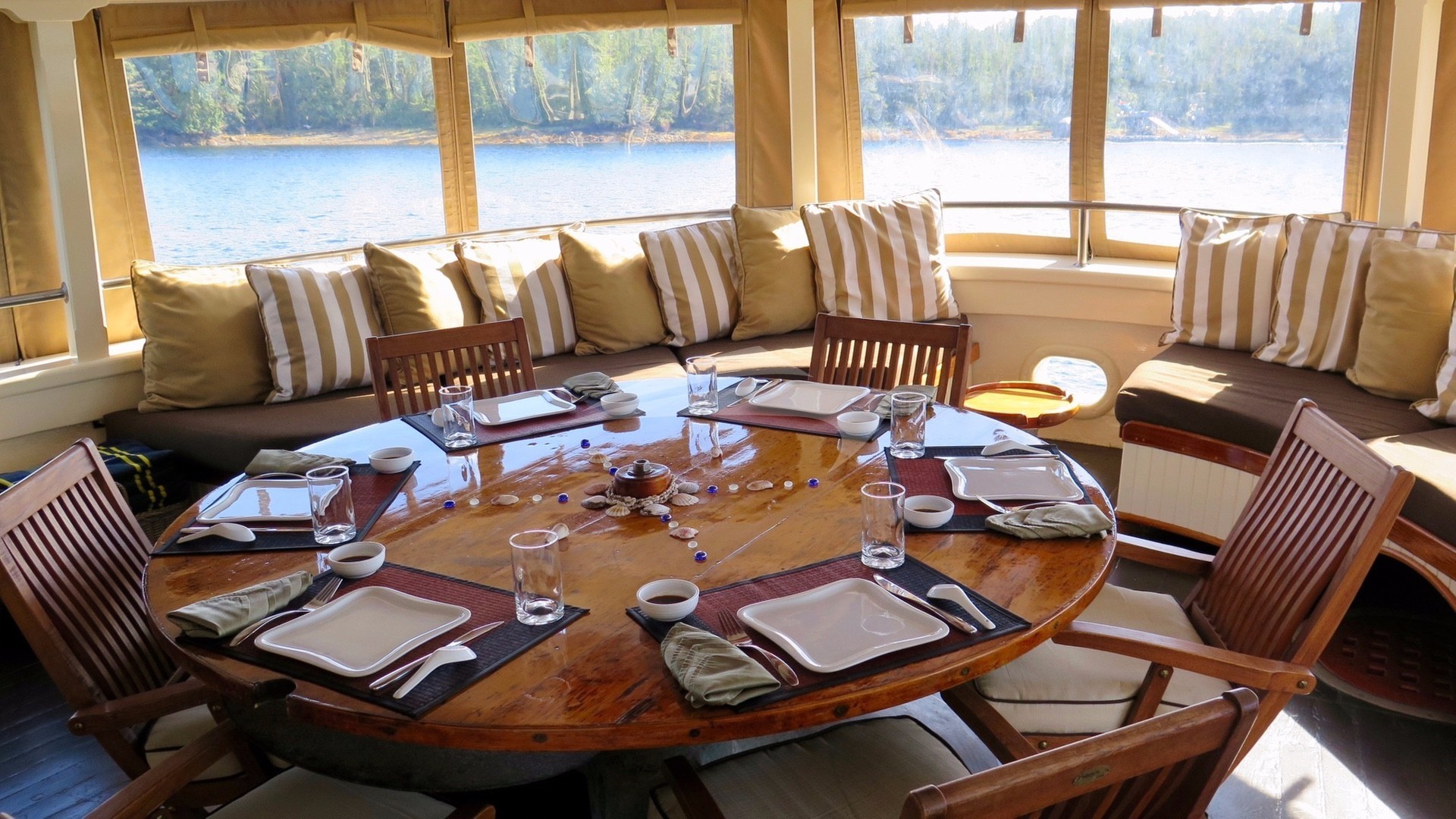 Main Salon dining seats 8. Aft Deck dining seats 10.