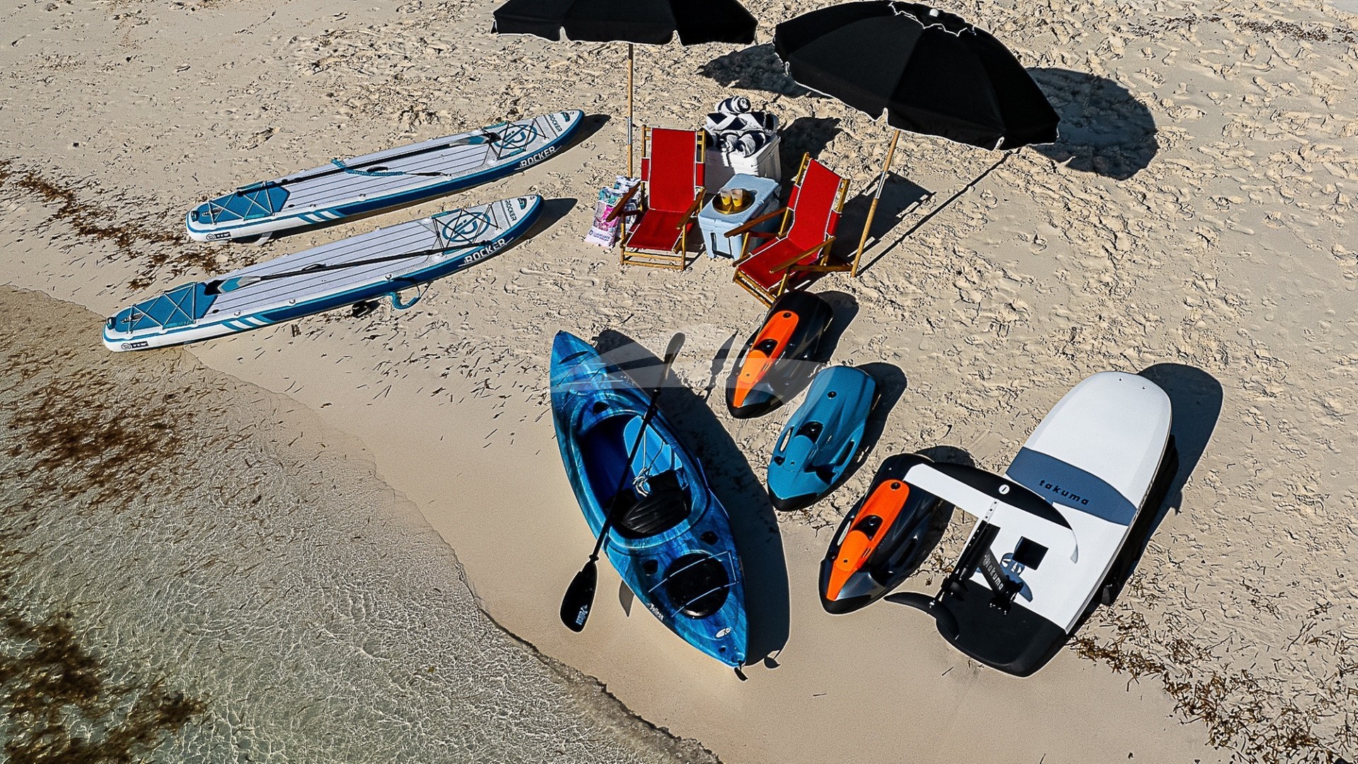 For fun on the water and days out to islands and bays, guests can choose from a range of the latest water toys: a 36' Invincible tender, SeaBob, paddle boards, kayaks, e-foil board, jet-skis, floating cabana, waterslide and more. For fishing enthusiasts, a 61’ Sportfish can be added to your charter experience.