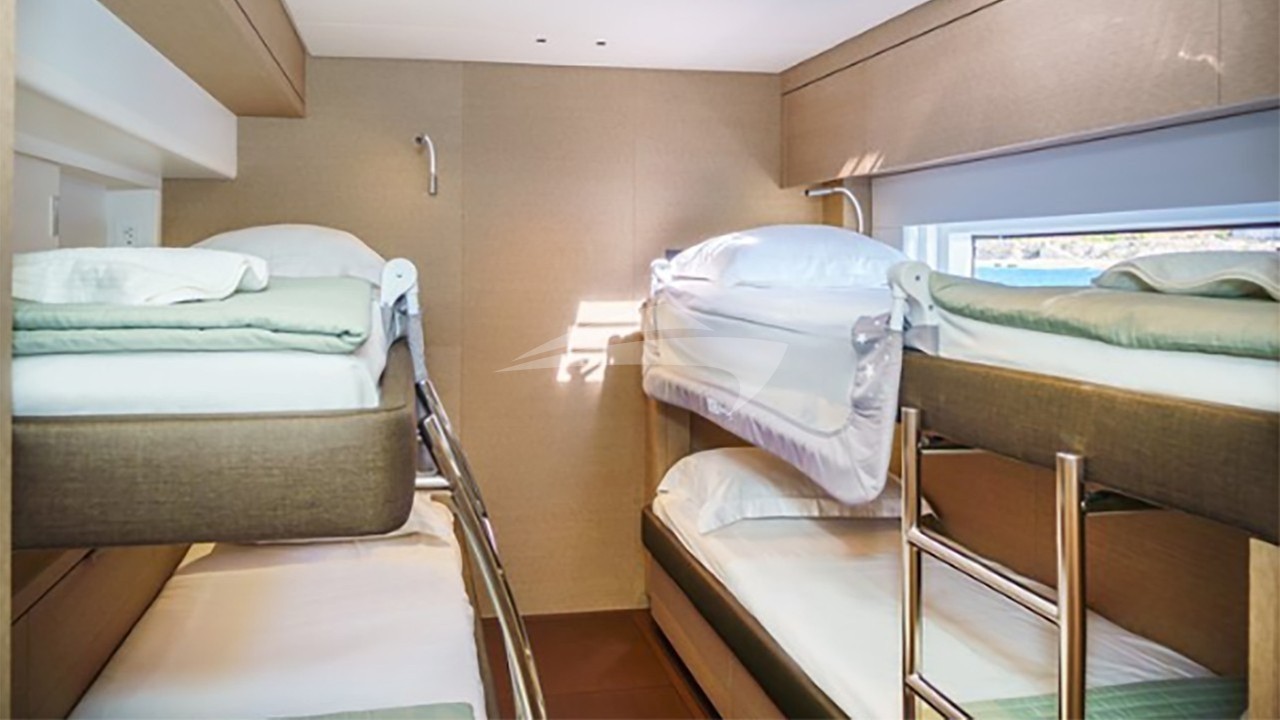 I master + 2 doubles for adults, and the midship port double twin cabin for teens/kids. Crew takes aft port cabin.
