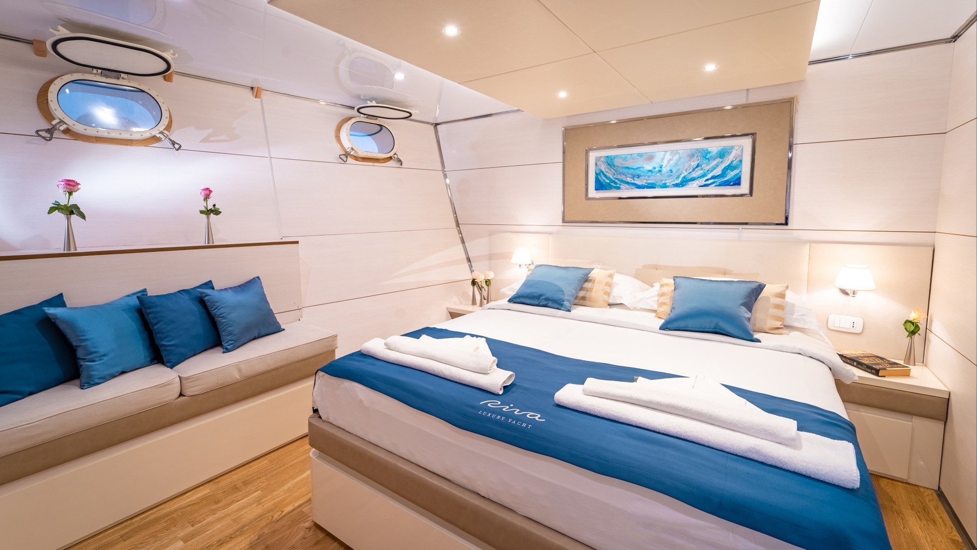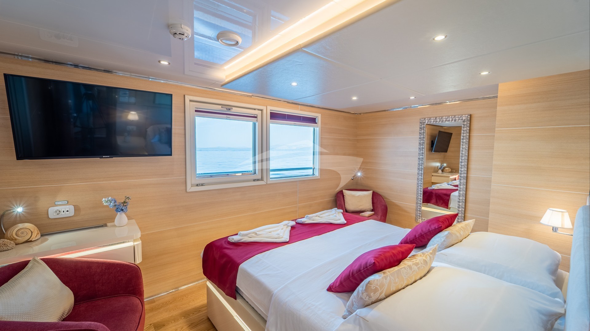 - VIP cabin with double bed. Private bathroom with shower box and home-type toilet.