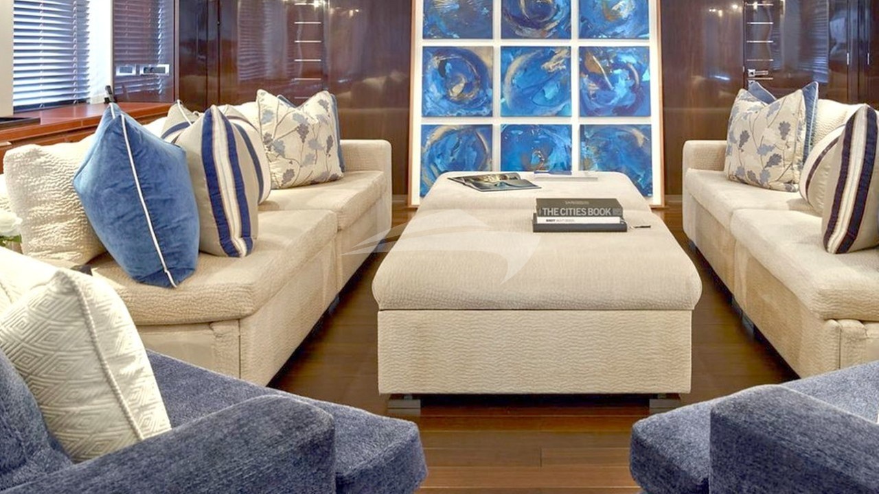 ROCKET offers a wide main deck salon with a dining table and lounge. Her Sky lounge is a one-of-a-kind bespoke design: 270-degree views and a large TV with surround sound for movie night. Her 6-stateroom layout accommodates 12 guests. It includes a full-beam en-suite Master, three Double, and two Twin staterooms.