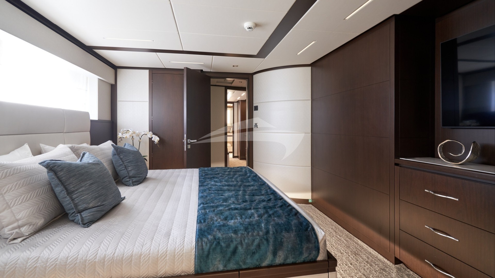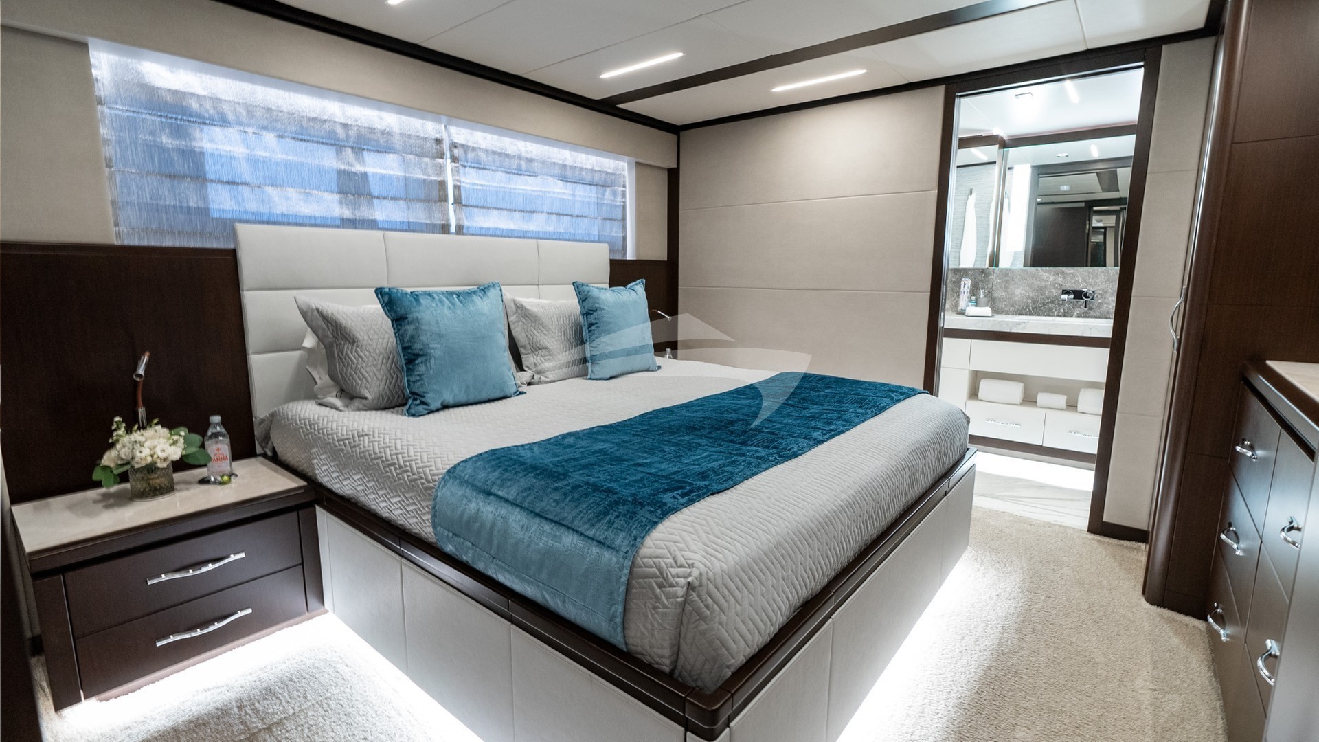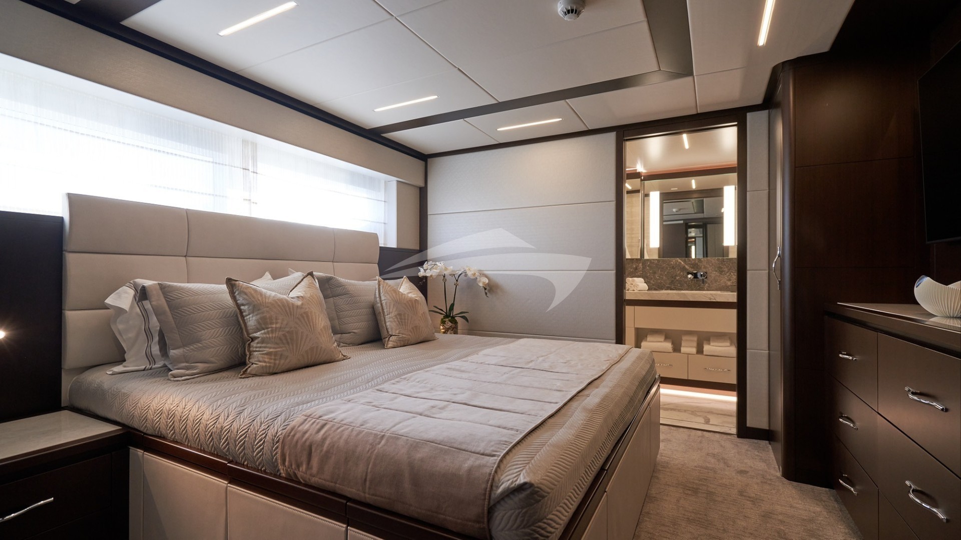 ROMEO FOXTROT's sleek exterior, crafted by Yacht interiors by Shelly, houses a luxurious interior featuring five opulent staterooms. The full-beam on-deck master suite and four VIP suites below deck, all with queen-size beds, can accommodate up to 10 discerning guests in ultimate comfort. Soft grey and white tones beautifully contrast with mahogany wooden floors, creating an atmosphere of refined elegance throughout the yacht.