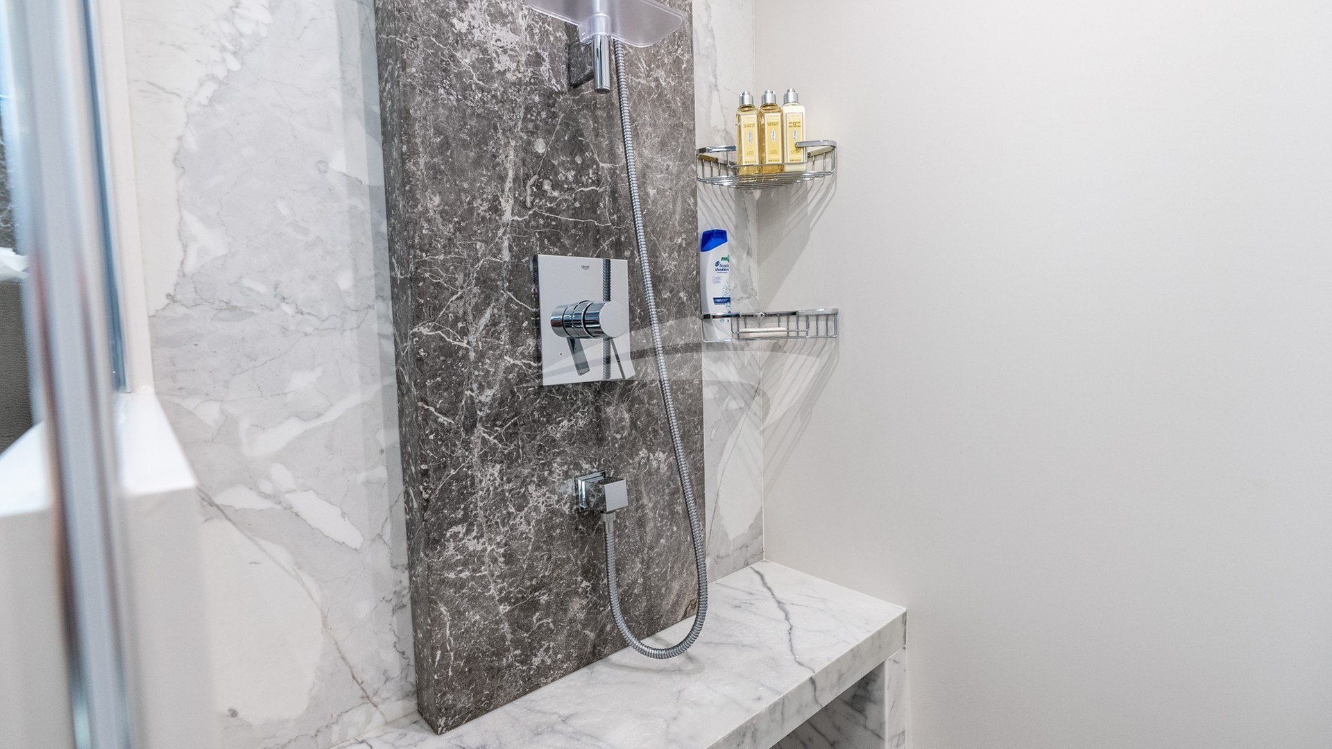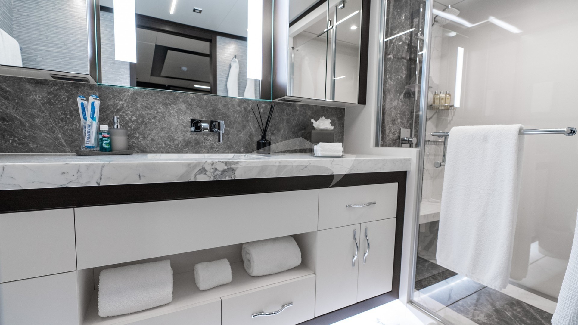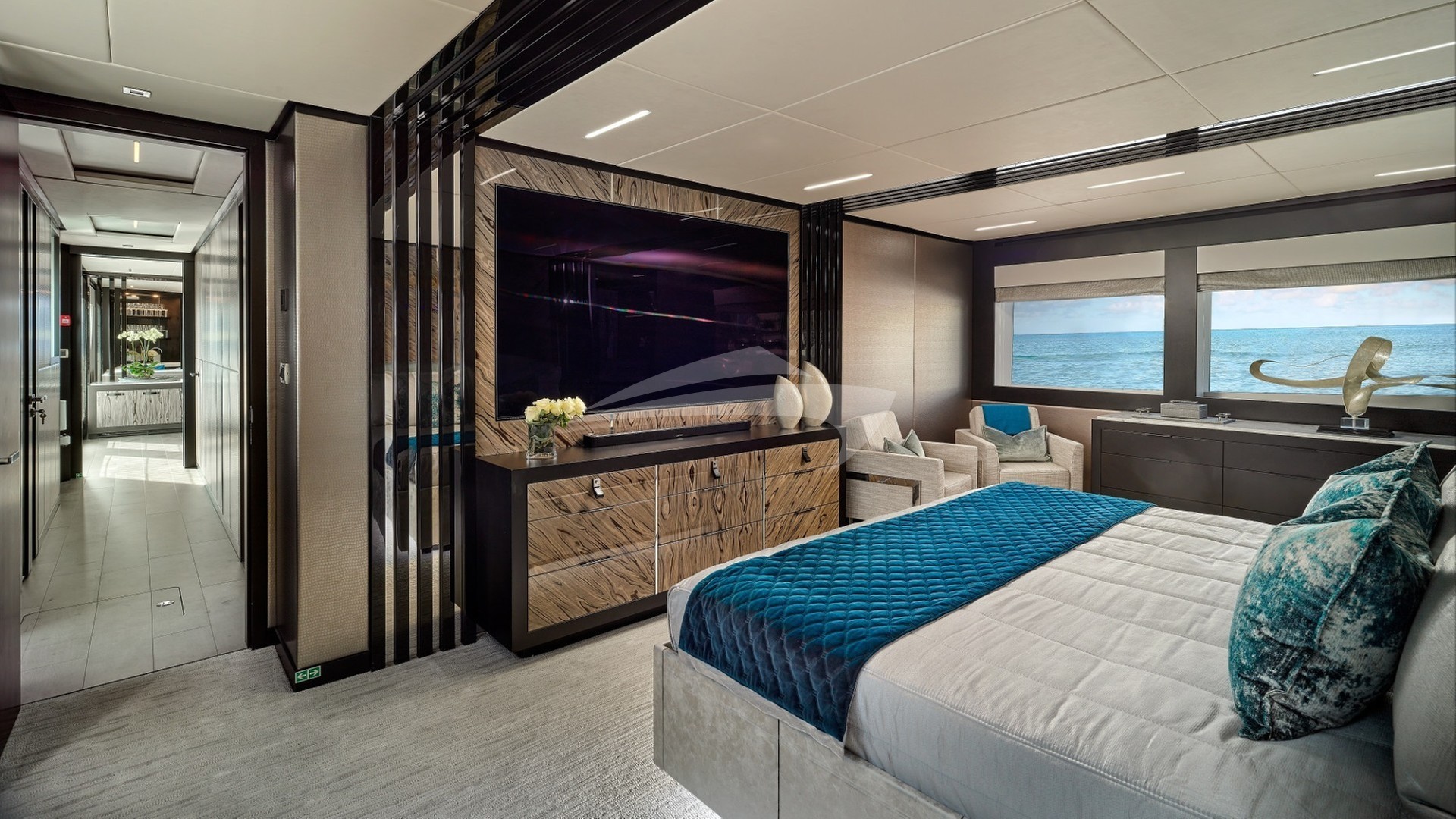 ROMEO FOXTROT's sleek exterior, crafted by Yacht interiors by Shelly, houses a luxurious interior featuring five opulent staterooms. The full-beam on-deck master suite and four VIP suites below deck, all with queen-size beds, can accommodate up to 10 discerning guests in ultimate comfort. Soft grey and white tones beautifully contrast with mahogany wooden floors, creating an atmosphere of refined elegance throughout the yacht.