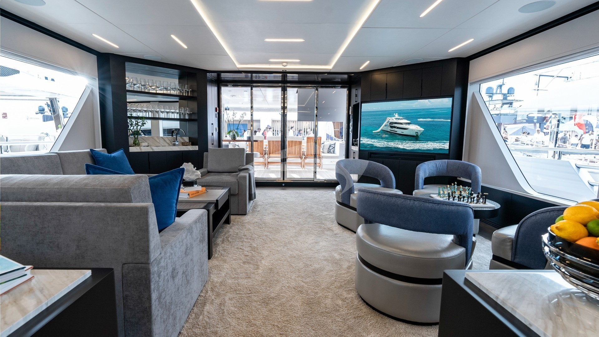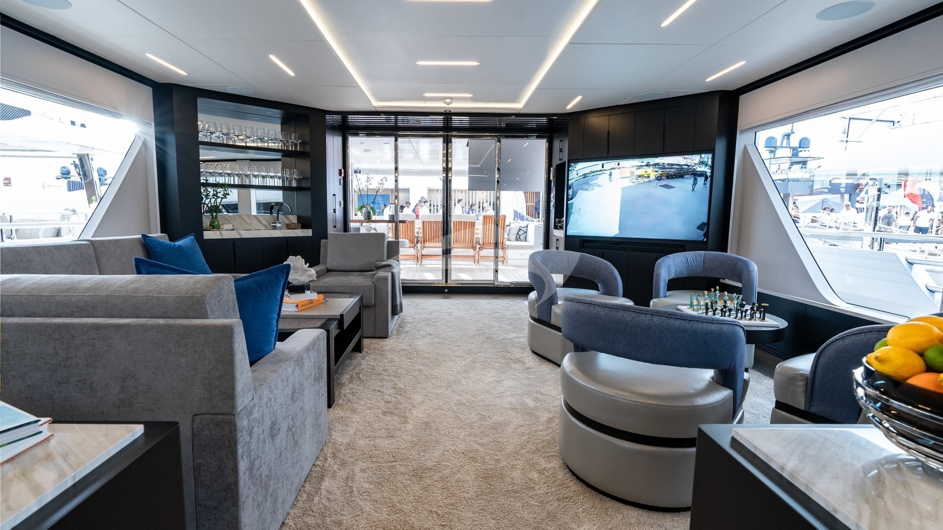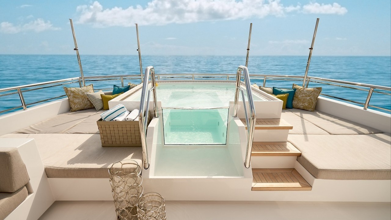 Elevate to the sundeck and immerse yourself in the waterfall infinity-style Jacuzzi and have lunch in the roomy dining area. An additional bar and day head are located on this level for accessibility and convenience. Roam around to the oversized sunbed on the bow and soak up some sun rays, all while getting lost in your favorite book…or the view! Moving down to the special feature in the beach club, there is a hydraulic swim platform that can open at anchor for sunbathing and spectating. Also at the beach club, take a turn in the steam room.