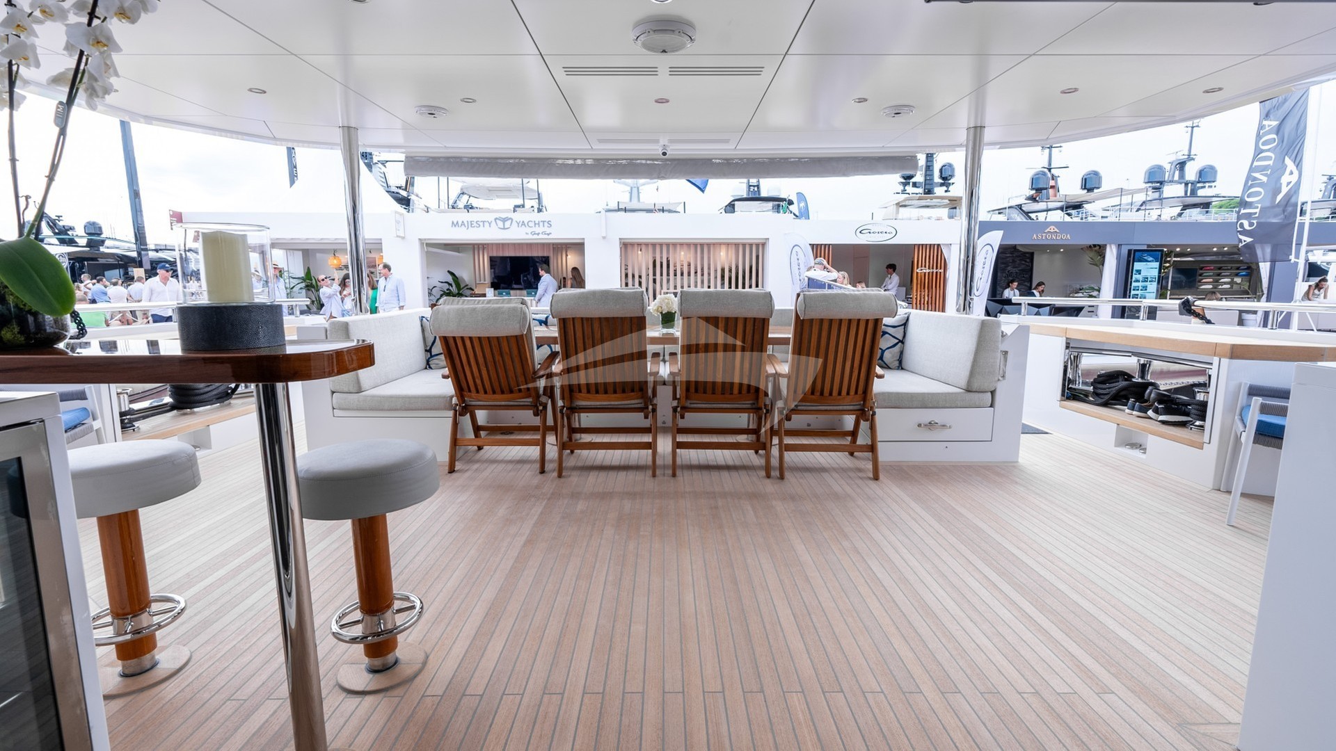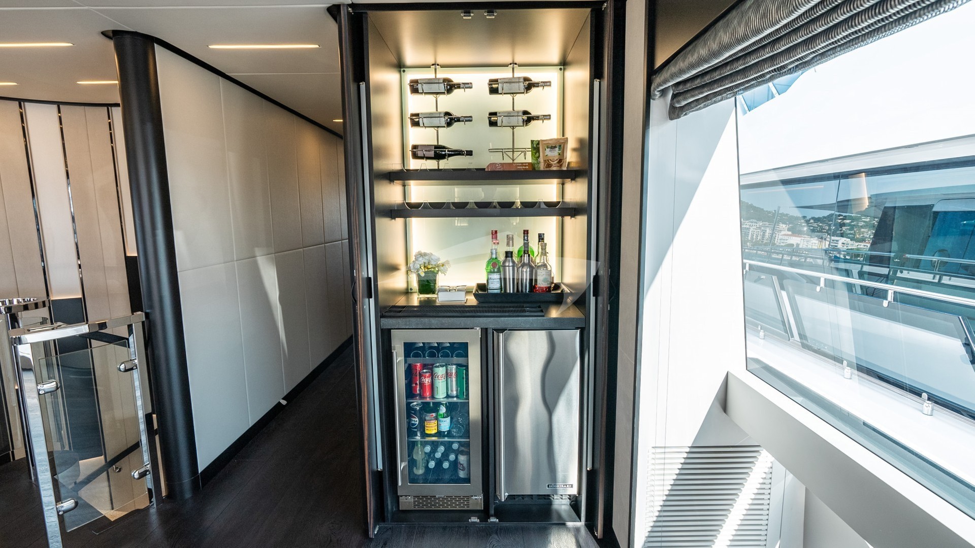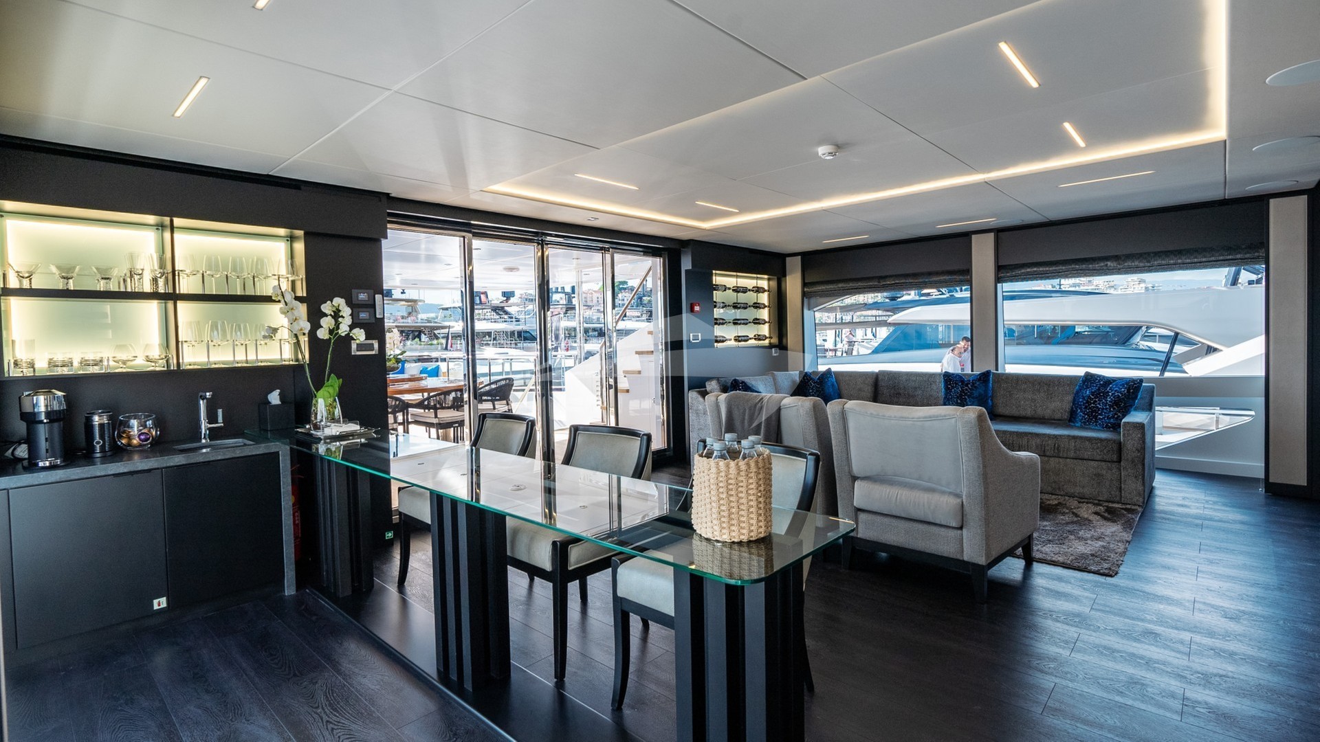Elevate to the sundeck and immerse yourself in the waterfall infinity-style Jacuzzi and have lunch in the roomy dining area. An additional bar and day head are located on this level for accessibility and convenience. Roam around to the oversized sunbed on the bow and soak up some sun rays, all while getting lost in your favorite book…or the view! Moving down to the special feature in the beach club, there is a hydraulic swim platform that can open at anchor for sunbathing and spectating. Also at the beach club, take a turn in the steam room.