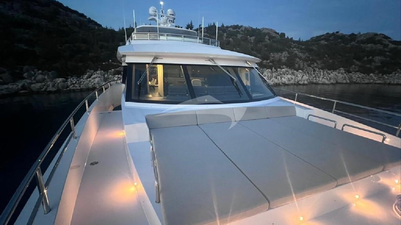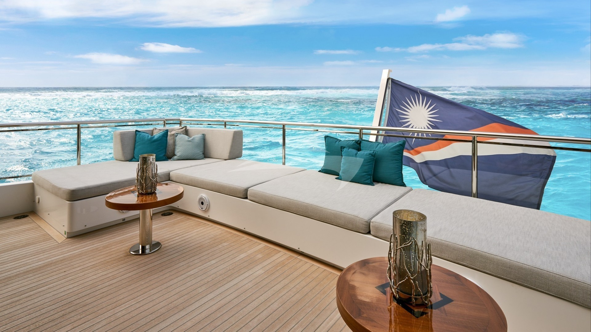 The yacht's expansive sundeck is a haven for relaxation and entertainment. Immerse yourself in the waterfall infinity-style Jacuzzi, savor alfresco dining in the spacious area, or bask in the sun on the oversized sunbed. The glass-top bar in the sky lounge offers breathtaking ocean views, while the lush salon, bathed in natural light, boasts state-of-the-art entertainment systems.