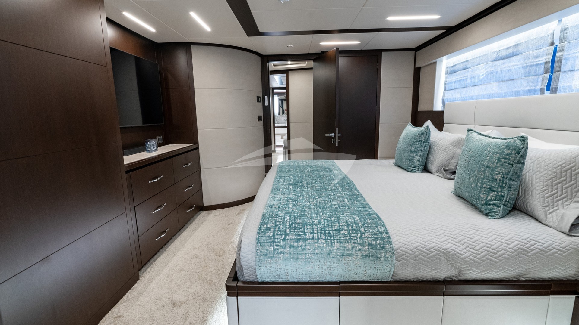 Her sleek design features a luxury five-stateroom configuration, including a full beam on-deck master suite. Below deck are 4 beautifully appointed queen staterooms all ensuite.
