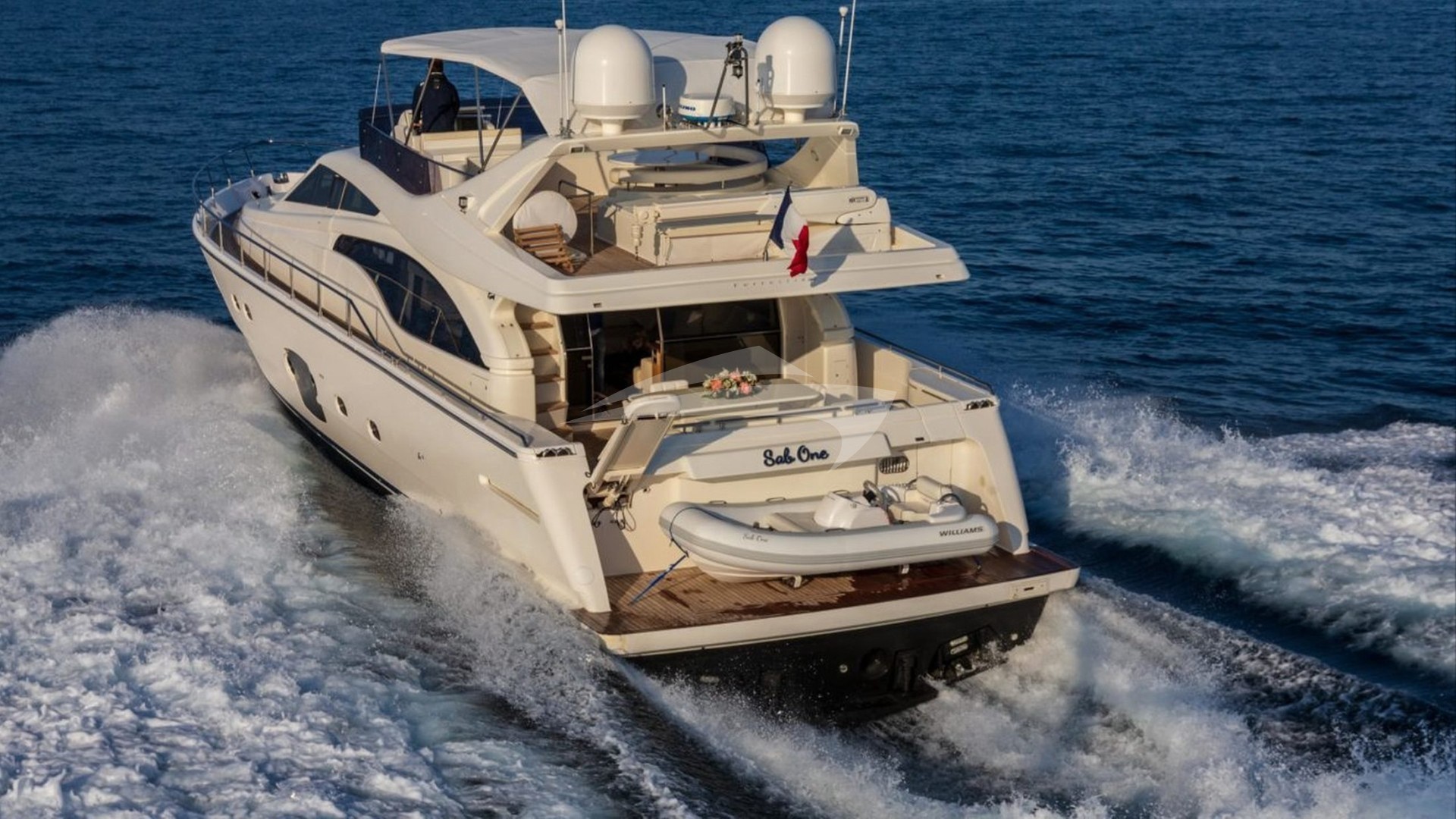 Sabone Yacht Charter is a 69' superyacht built by Ferretti in 2008. She sleeps 8 and holds 2 crew and is located in West Mediterranean and West Mediterranean. She can be booked for a private luxury charter at a rate of $36,642 per week. Please check with your Denison Charter Specialist for more info.