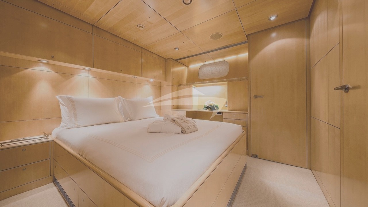 1 x full-beam master stateroom, located aft, with king size bed, 32" Smart TV and is en suite with a shower and double sink.