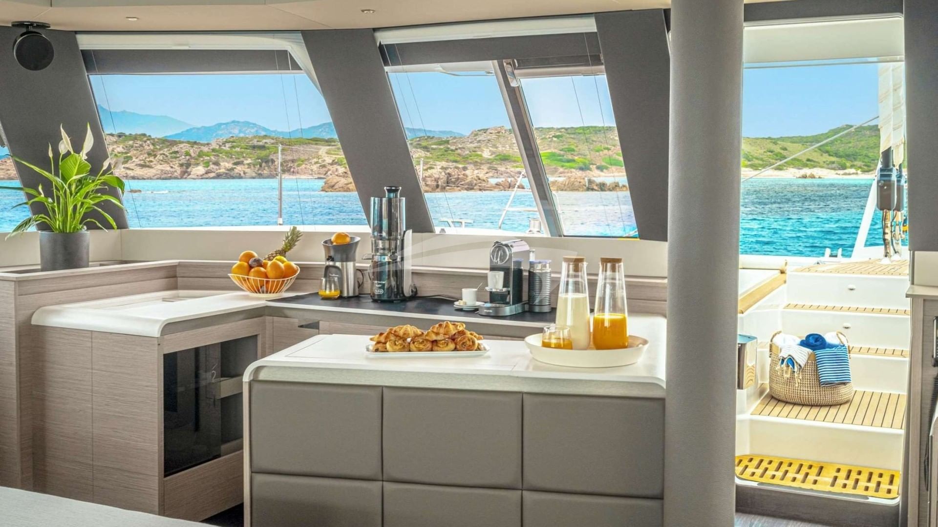 SEMPER FIDELIS' unique design has the kitchen located in the Babord hull, meaning grilled food can be enjoyed on the cockpit's plancha or taken to the table of the large aft cockpit, which can accommodate up to 10 guests. The boat is also characterised by its large flybridge protected from the sun, which allows meals under the midday heat to be enjoyed elegantly, and its 4 sunbeds close by to take in the unbeatable views at sunset.