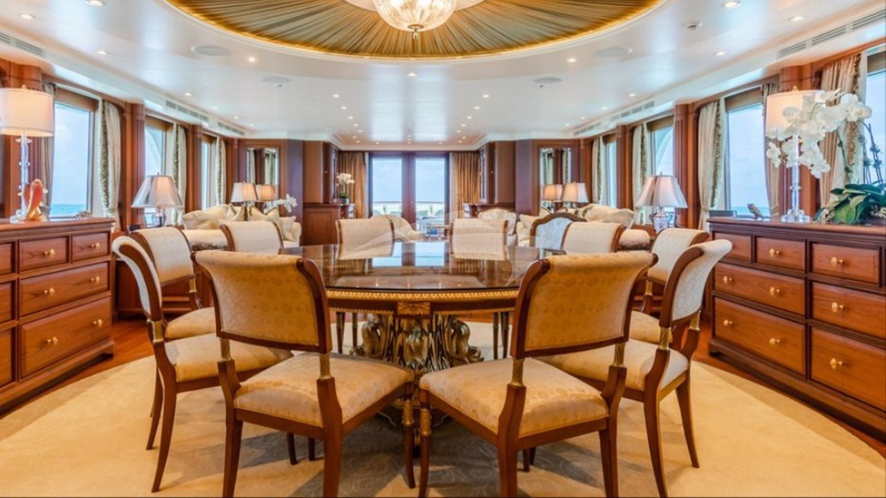 SHADOWL's exquisite craftsmanship is evident from bow to stern. The yacht's dark green hull exudes elegance, while the intricate woodwork and hand-carved features throughout the vessel showcase the pinnacle of maritime artistry. The main salon boasts a resplendent circular dining table, a true masterpiece that sets the stage for unforgettable meals.