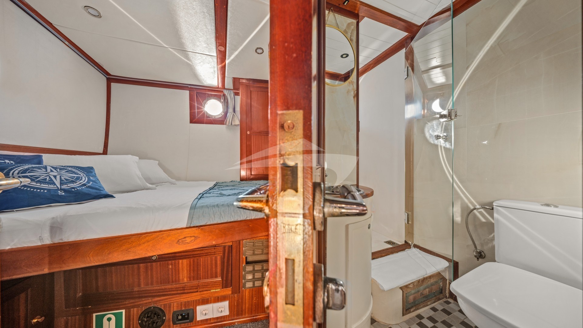 Master cabin (20 m2) with double bed (180 x 190 cm). Private bathroom with shower box and home-type toilet.