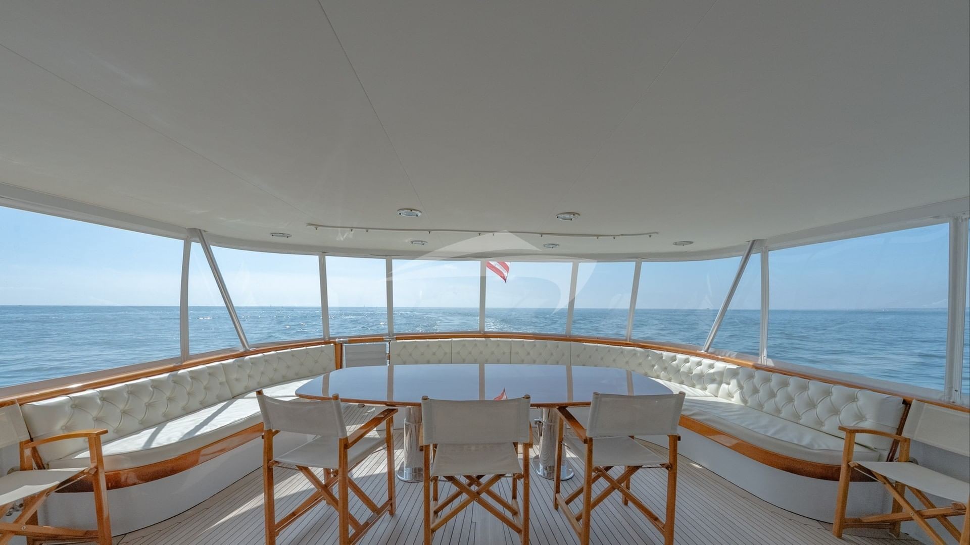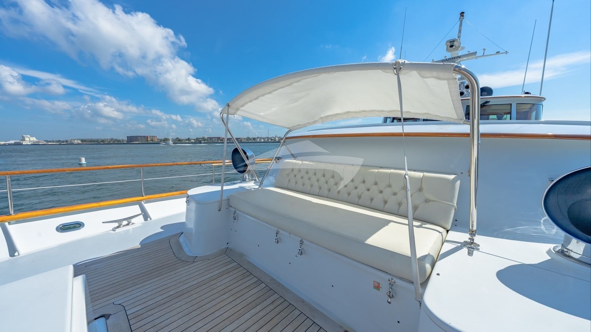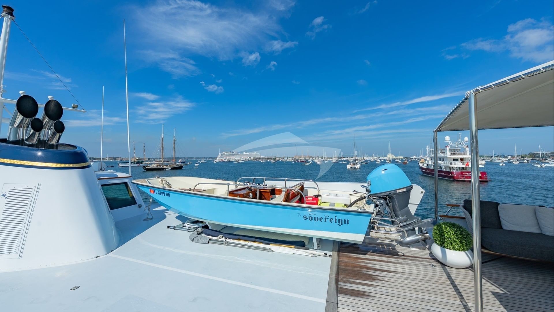 SOVEREIGN's aft deck features built-in upholstered seating and a twin pedestal large varnished teak table, lending a gracious air to al fresco entertaining and dining. Up on the boat deck is more outdoor relaxation space, with or without shade.Dedicated sun lovers can be found sunbathing on her fore deck, offering complete privacy at sea and when moored in port.