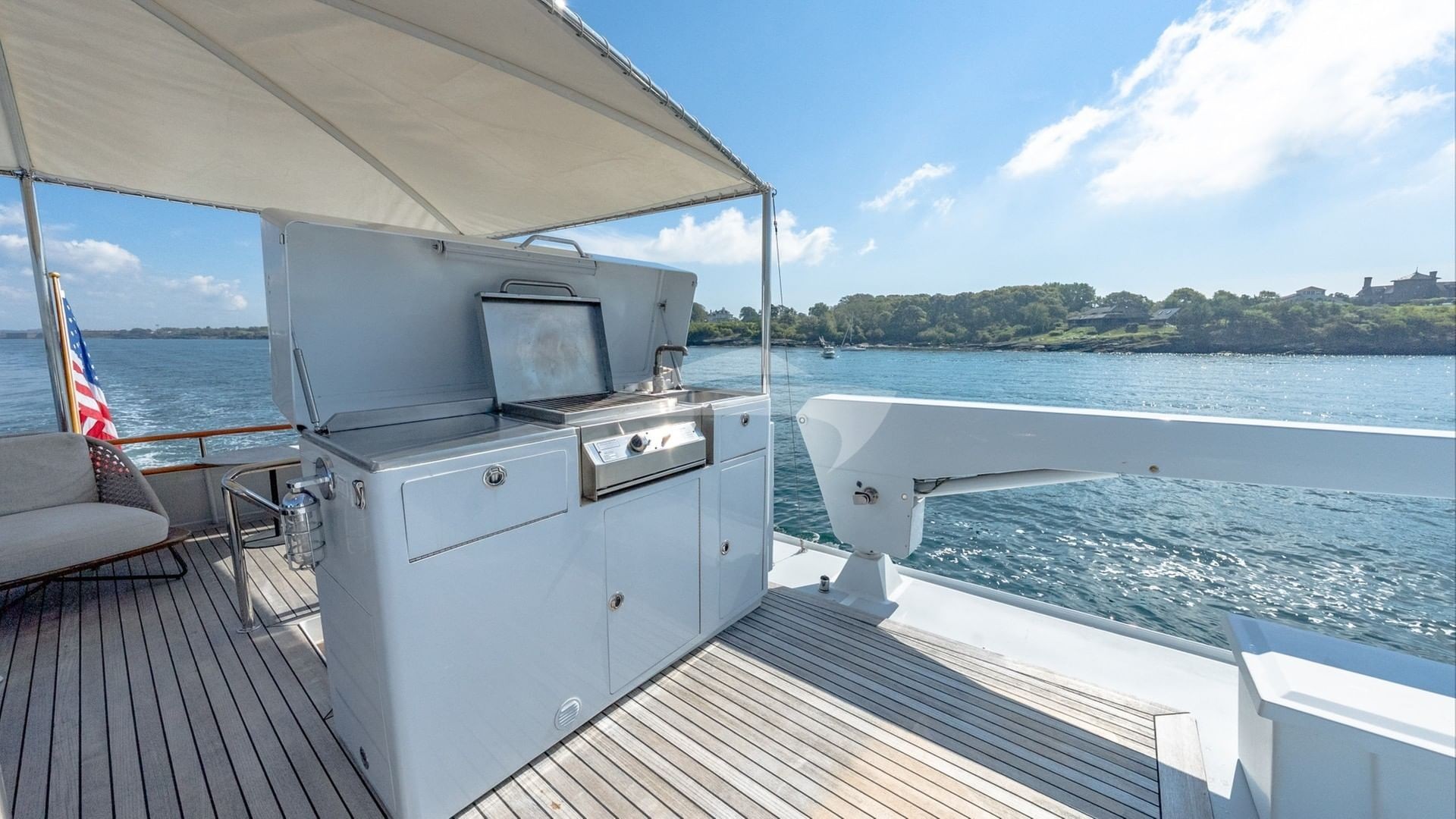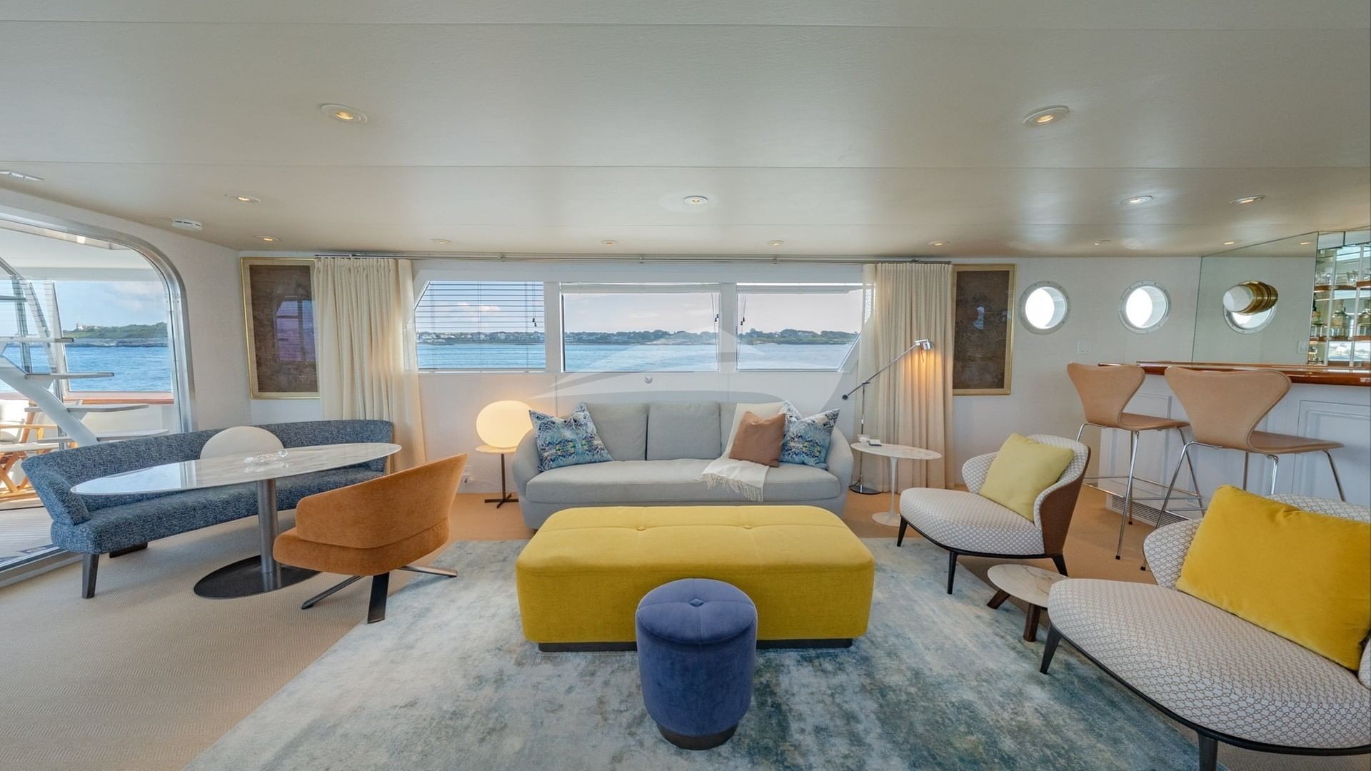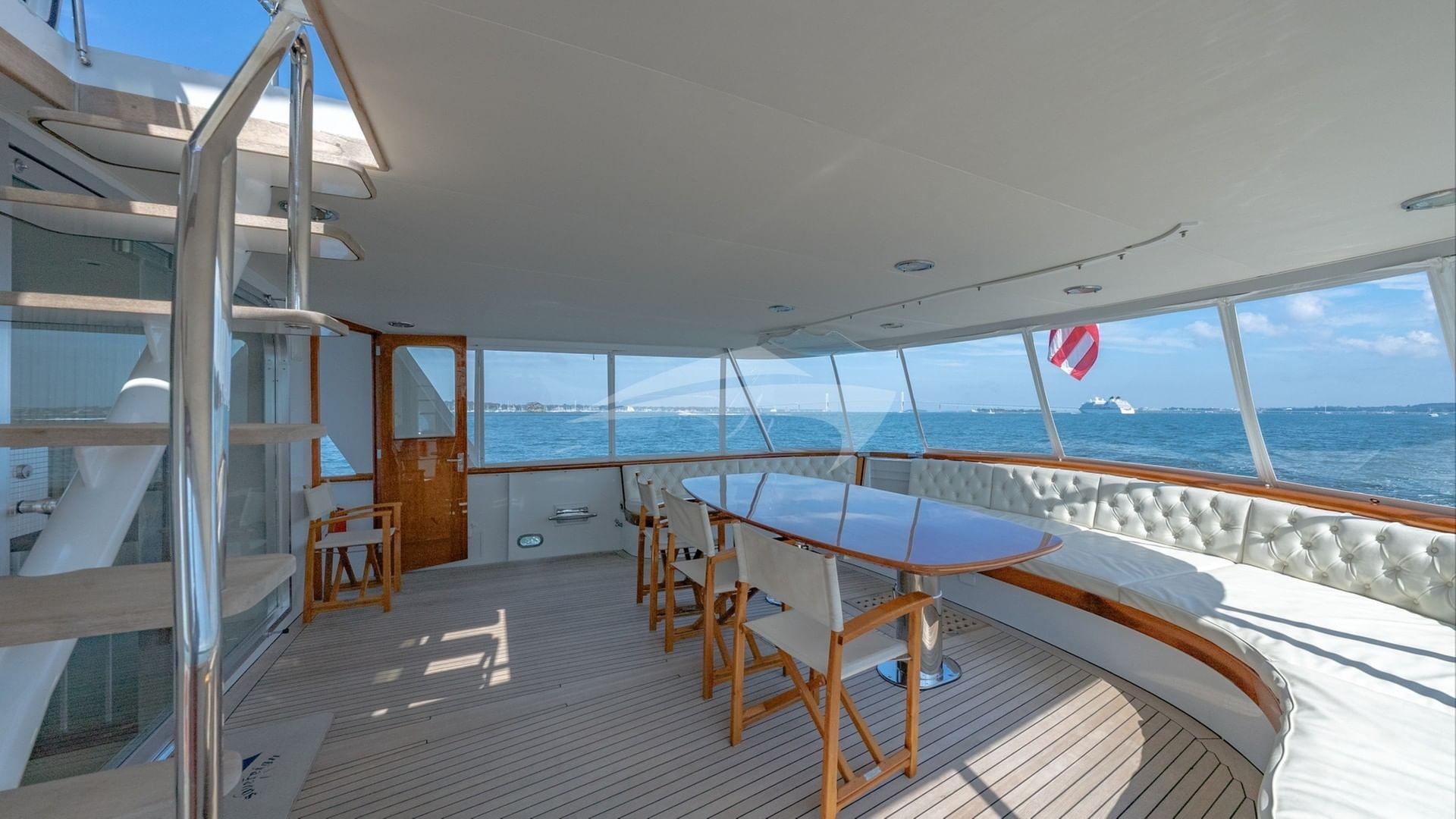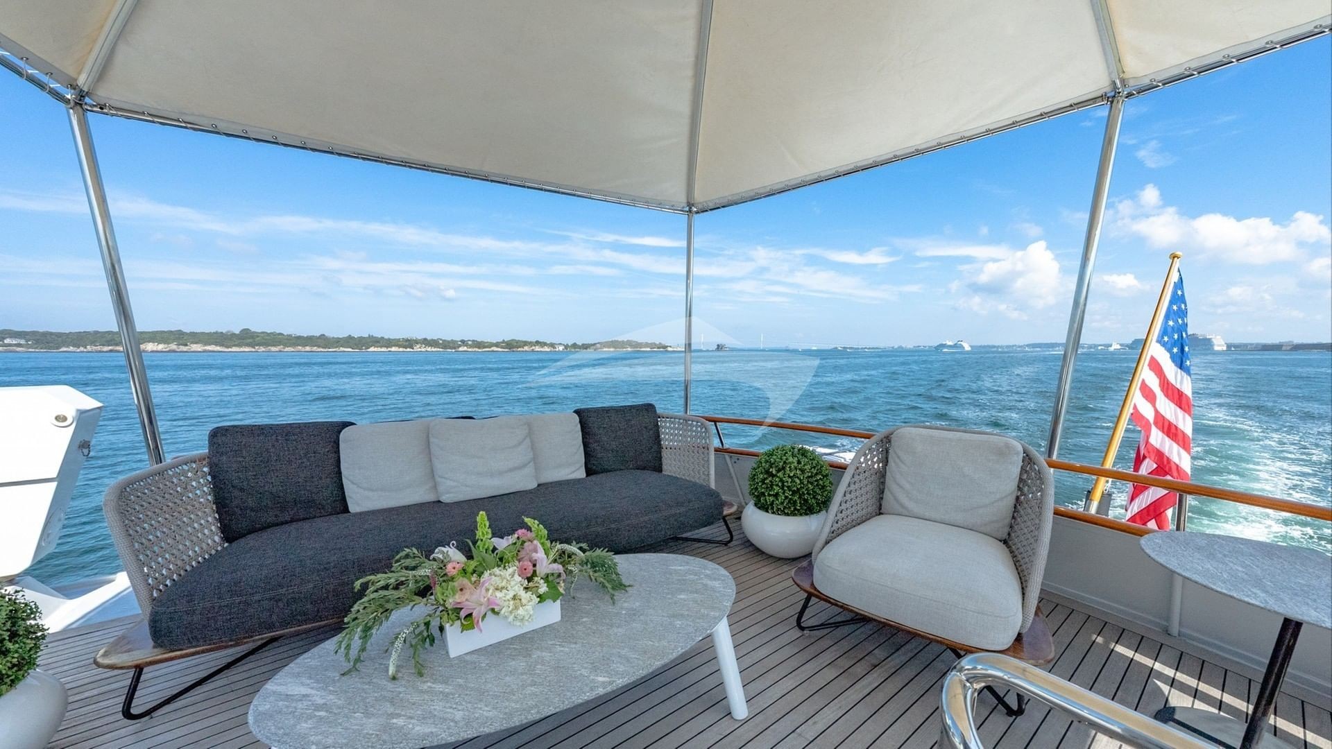 SOVEREIGN's aft deck features built-in upholstered seating and a twin pedestal large varnished teak table, lending a gracious air to al fresco entertaining and dining. Up on the boat deck is more outdoor relaxation space, with or without shade.Dedicated sun lovers can be found sunbathing on her fore deck, offering complete privacy at sea and when moored in port.