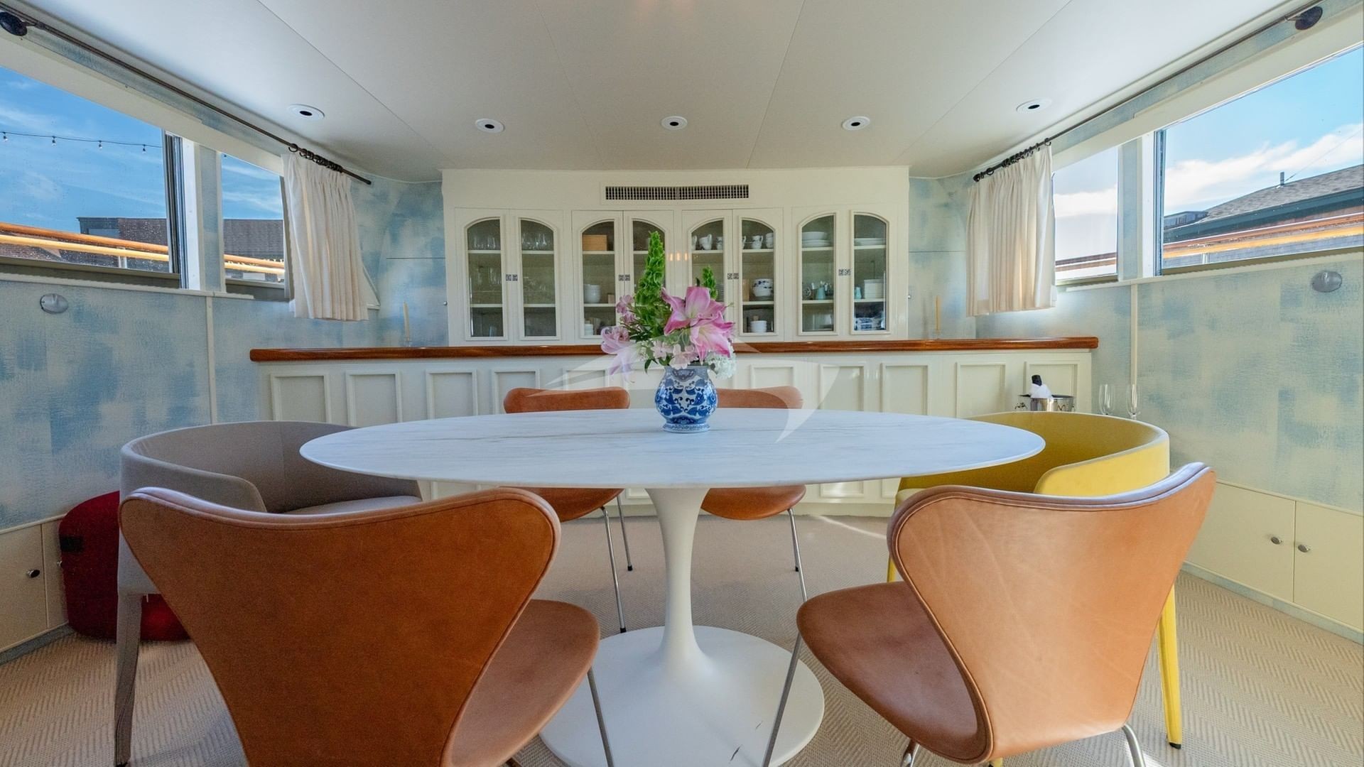 SOVEREIGN's saloon features a large lounge area with comfortable seating and an entertainment center, including a large television screen, while forward is a formal dining area with seating for up to eight guests.