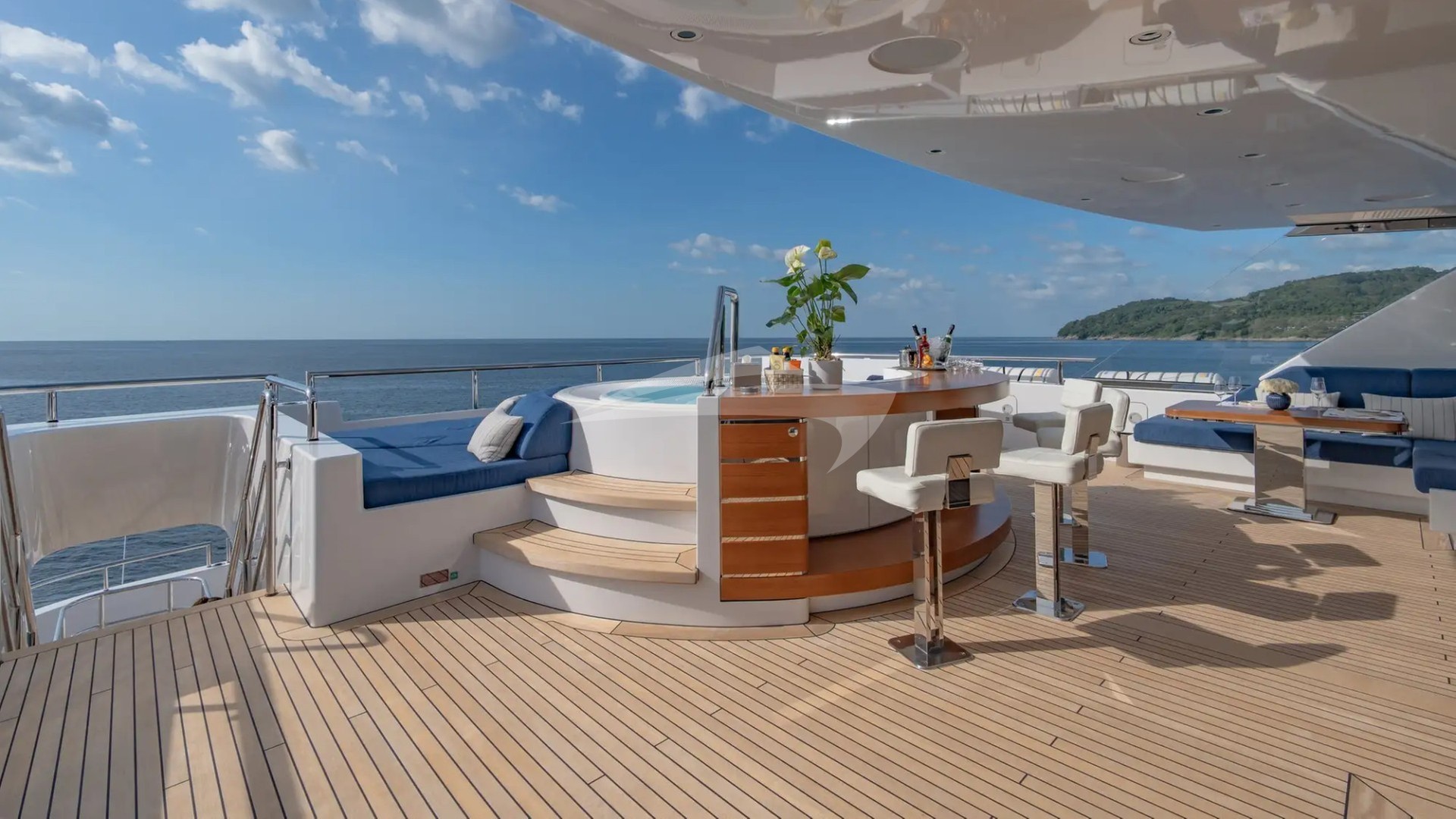 The impressive main lounge is a popular gathering space, offering ample room for relaxation and featuring a large TV screen, which separates it from the spacious dining area. Designed to seamlessly blend indoor and outdoor living, large glass doors lead to the main deck aft, where guests can enjoy shaded al fresco dining at the large circular table, comfortably seating up to 12. Enjoy a leisurely breakfast here before heading to the sun deck, where the jacuzzi is flanked by sun pads and a convenient sit-up bar.