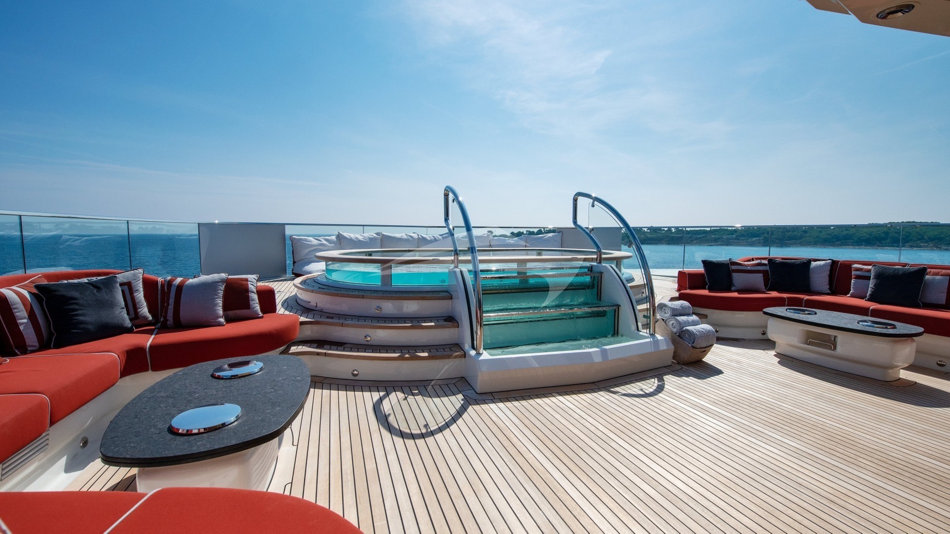 The SUNRAYS yacht has exceptional exterior deck areas. There’s an al fresco dining area that seats 22, and she boasts three different Jacuzzis, as well as a large pool. You can even party the night away with her music deck featuring a DJ and speaker system.