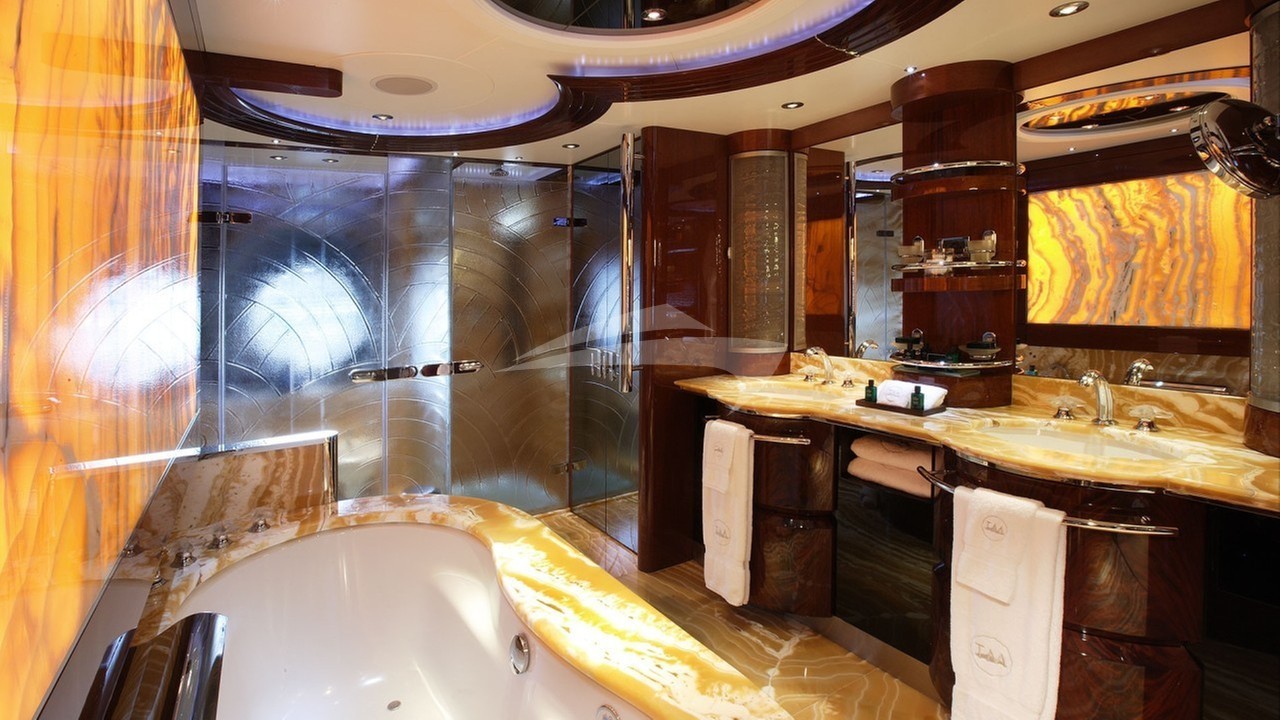 Step inside to discover an interior that marries Asian influences with Art Deco touches, creating a unique and lavish atmosphere. The main salon and formal dining area exude sophistication, while the sky lounge offers a more relaxed setting with its inviting curved sofa and seamless access to the bridge deck aft.
