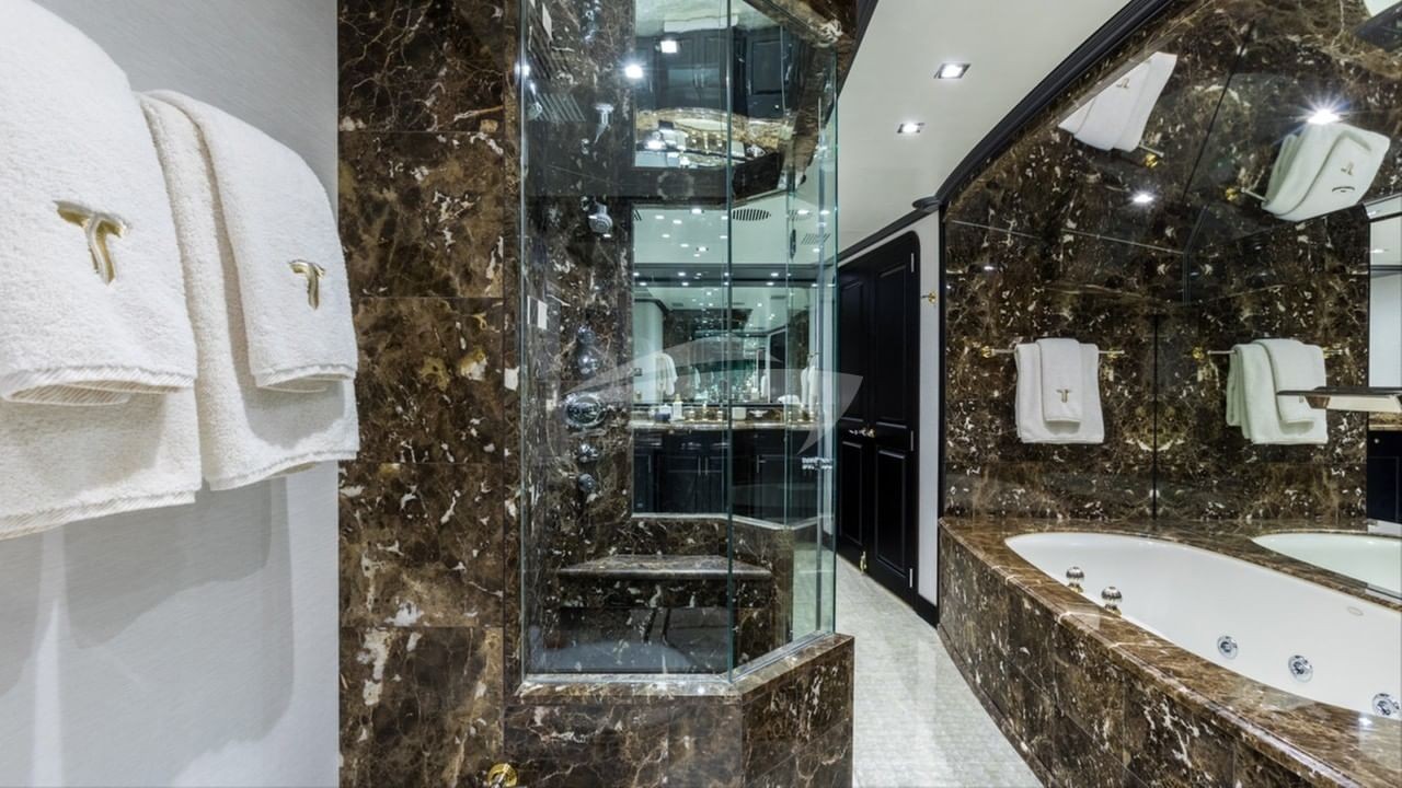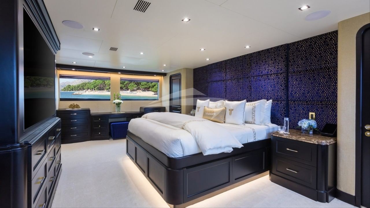 TANZANITE brings big-yacht vibes with incredible space for her size, making her a standout for unforgettable charters. Previously ex: FIGHTING IRISH she sleeps 10 guests in total comfort, with a full-beam master suite on the main deck and four king cabins below—two of which can easily convert to twins for added flexibility. Every cabin comes with its own Jacuzzi bath, giving each guest their own little slice of luxury. A dedicated crew of nine keeps everything running smoothly.
