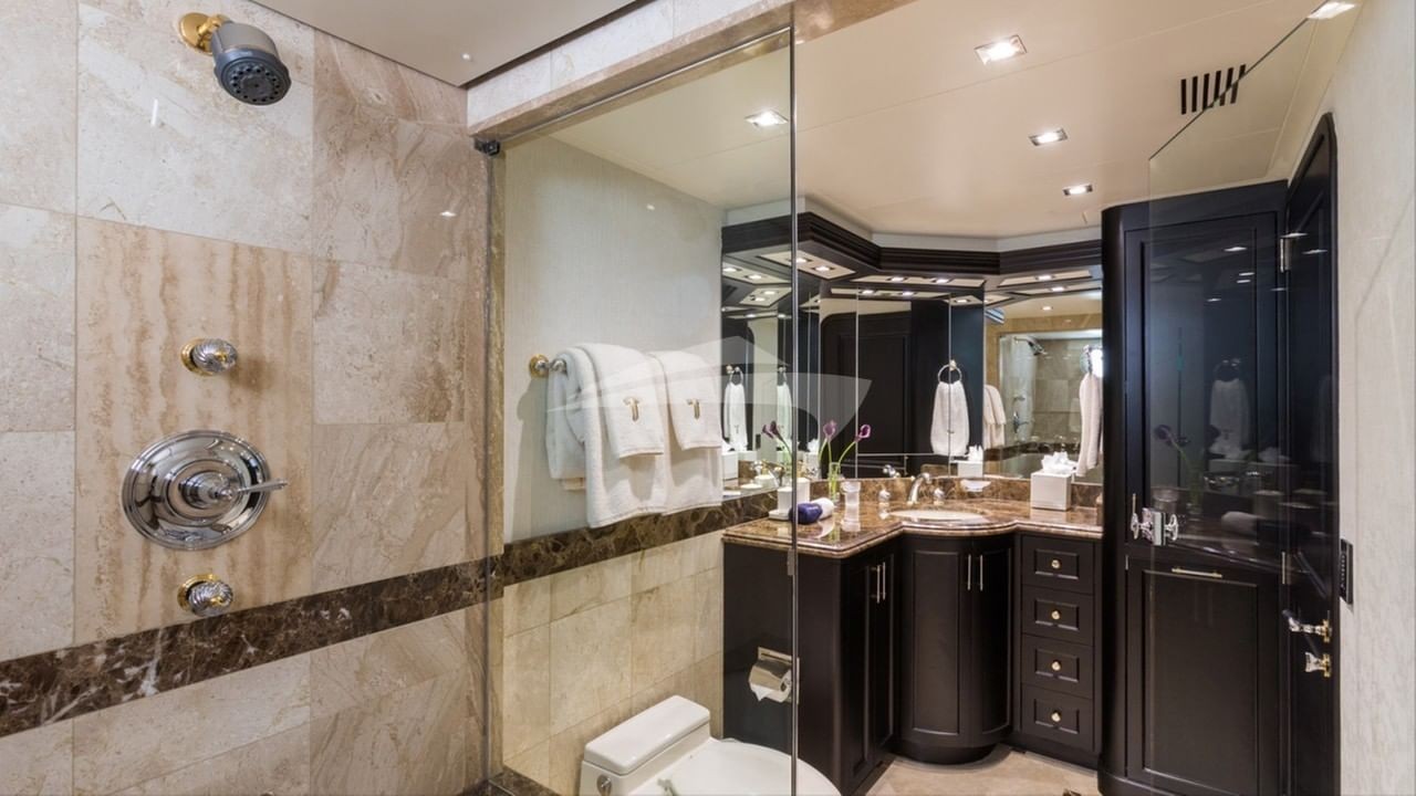 10 guests in 5 suites comprising a master suite located on the main deck, two VIP cabins and two cabins that can operate as twins or doubles. There are 5 beds in total, all can be Kings. She is also capable of carrying up to 9 crew onboard to ensure a relaxed luxury yacht charter experience.