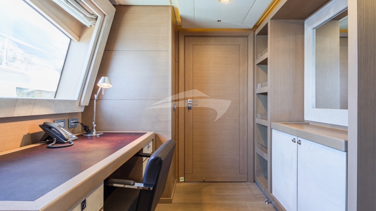 1 x master stateroom, with king bed (180 x 200cm), smart TV, separate office, two wardrobes and is en suite with shower and bath