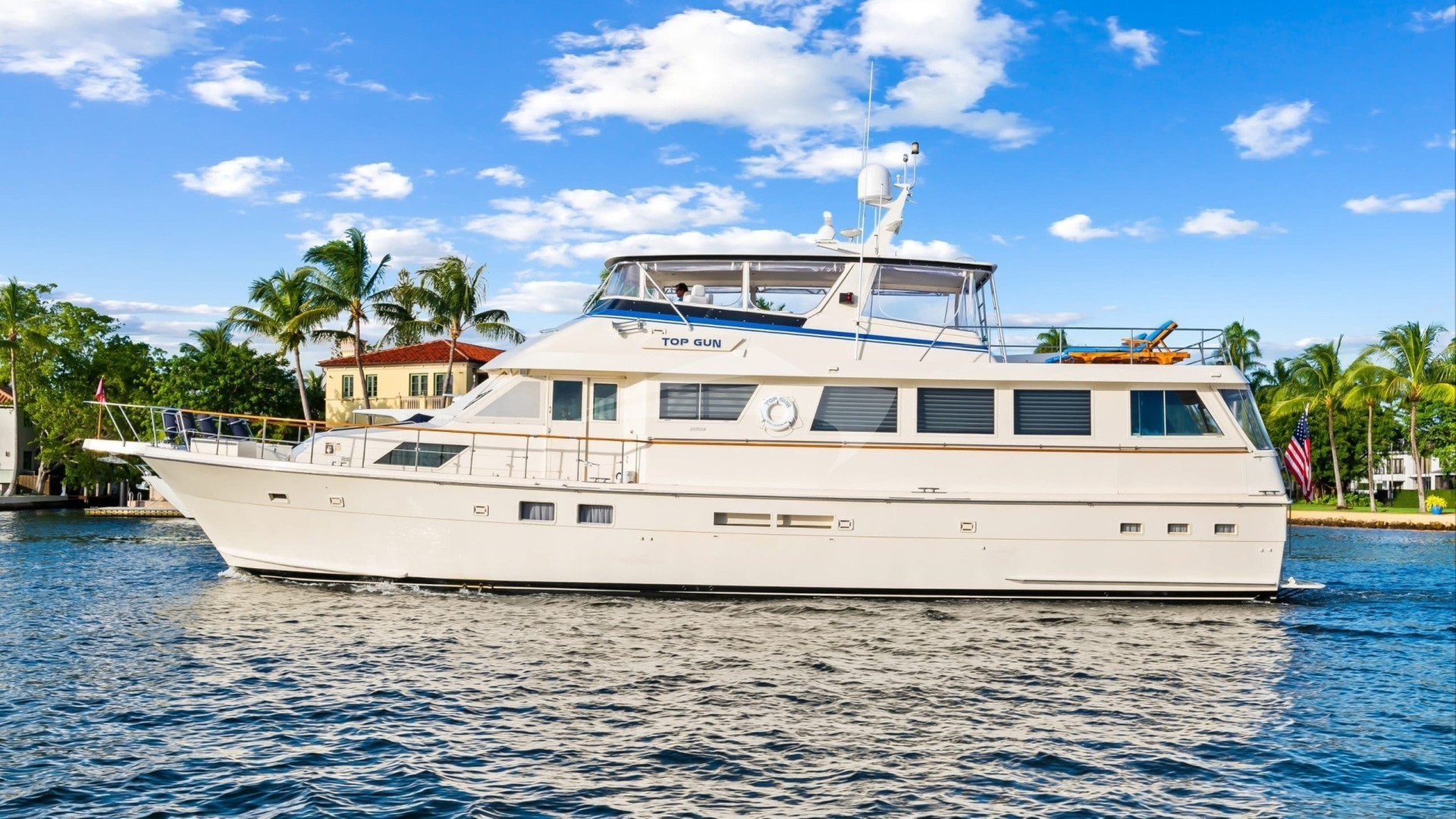 Top Gun Yacht Charter is a 69' superyacht built by Hatteras in 1989. She sleeps 8 and holds 2 crew and is located in Caribbean, East Coast United States and Caribbean, East Coast United States. She can be booked for a private luxury charter at a rate of $28,000 per week. Please check with your Denison Charter Specialist for more info.