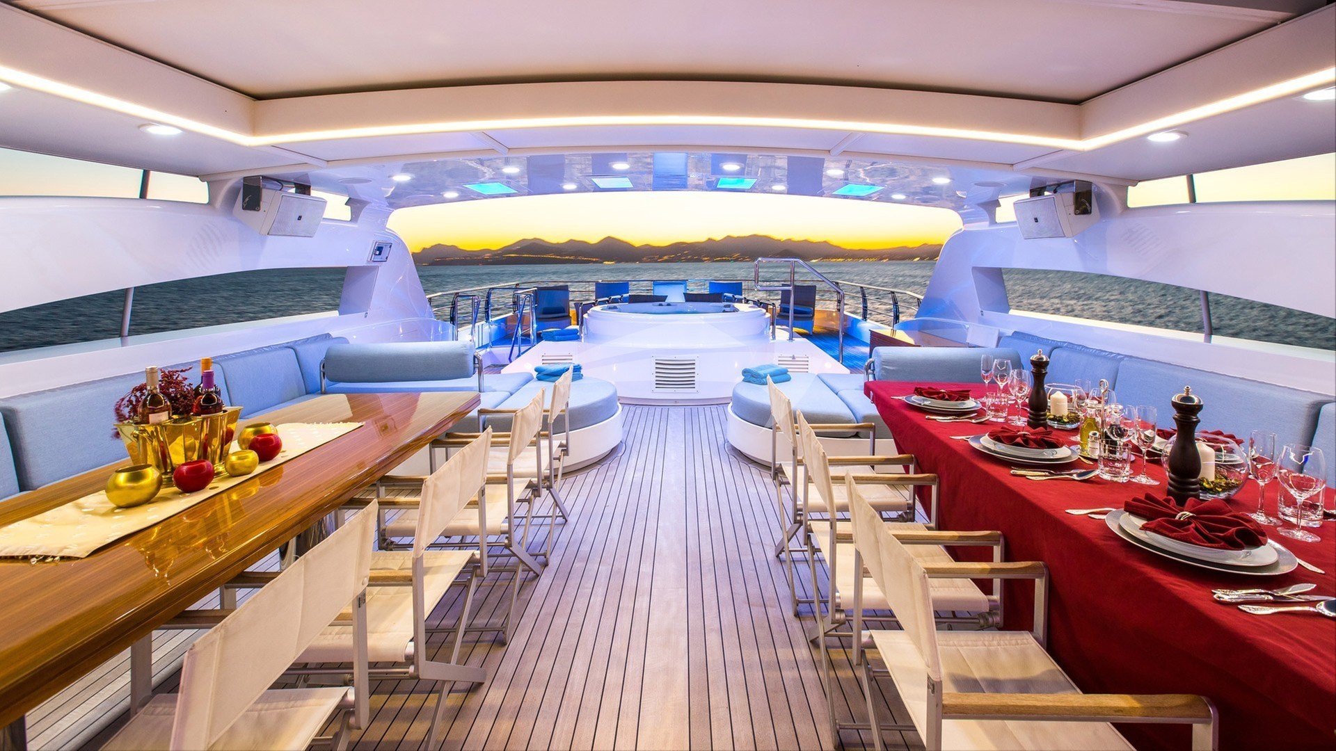 Since her dedicated refit, VERTIGO boasts voluminous, sumptuously redesigned interiors. For those who love to soak up the sun, she features the largest sundeck in her class, complete with a double-glass-fronted heated pool offering uninterrupted views. A spacious swimming platform also affords guests a blissful close-to-the-water experience.