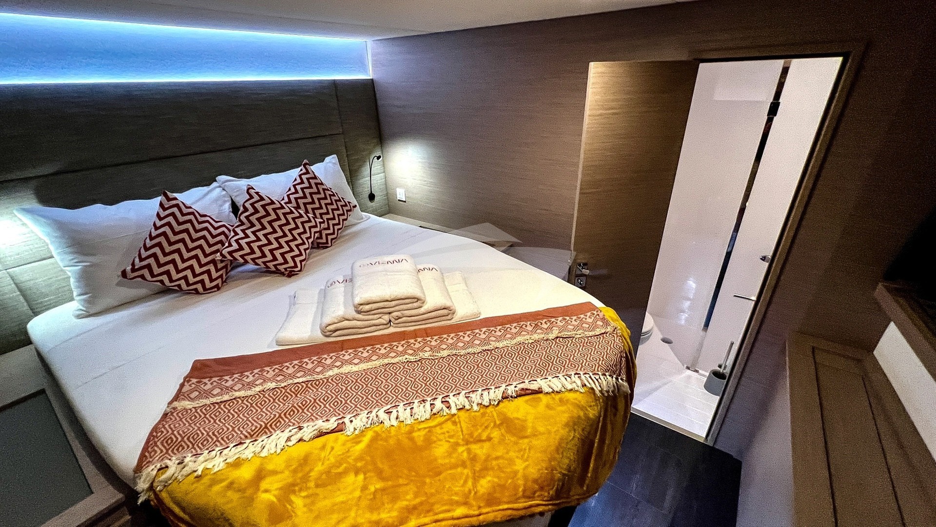 All 4 cabins are en-suite. Each cabin features comfortable queen size beds with padded headrests, reading spotlights, USB chargers, spacious nightstands, decorative pillows and comforters, soft mattress toppers and luxurious Egyptian cotton duvet covers and pillow selections.