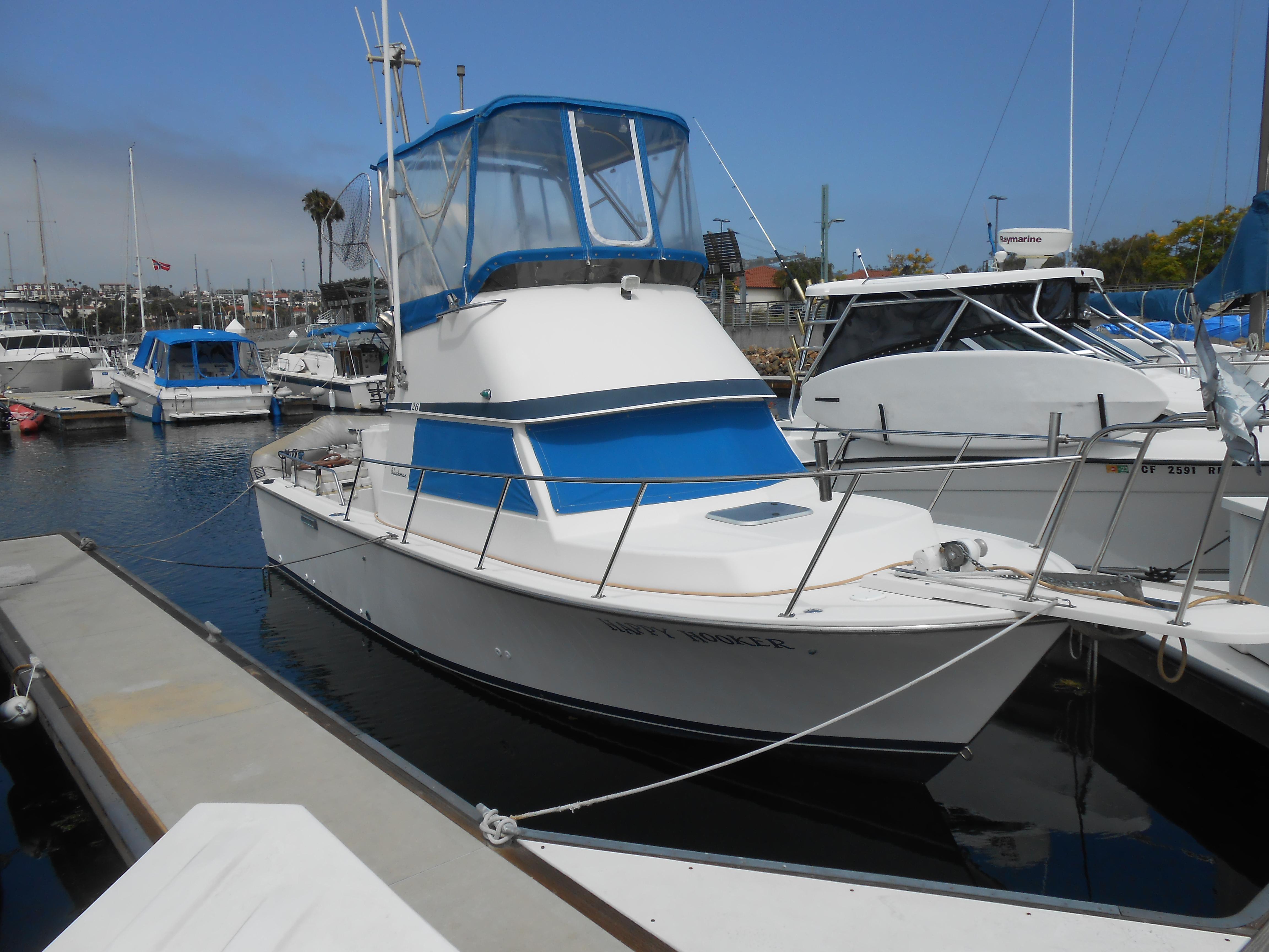A great fishing machine. This Blackman is unique with a 281 HP Volvo diesel and shaft drive, not outdrive. The straight shaft Volvo diesel engine was installed by Don Blackman in 2012. Comes with a new Baja dual axel trailer. There is a custom fold-down arrangement for the flybridge enclosure to facilitate easy trailering. Fully rigged for fishing it also features a full galley and enclosed head with shower.