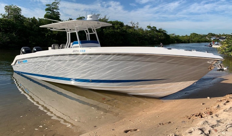 ARTH 333 model, 33′ Fishing Boat, with outboard engines, private bathroom, transom door, and many other differentials.