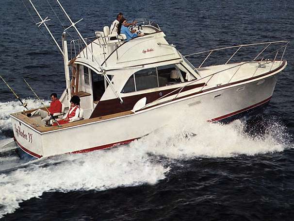 Although not introduced to the boating public until 1971, the Egg Harbor 33 Sedan quickly became one of the most popular and successful inboard cruisers ever built. Certainly, it's one of the most beautiful. Part of the reason behind this boat's popularity is its versatility. Sport fishermen immediately recognized the 33 Sedan's inherent capabilities for offshore game fishing. Cruising families found spaciousness and comfort ideal for their interests. And everyone agreed that the level of quality throughout was unique among production power cruisers at that time. Perhaps of even greater importance than these, however, is the fact that it was the 33 Sedan that pioneered Egg Harbor's unique construction methods - methods that merge the strength and easy maintenance of a one-piece fiberglass hull with the design flexibility and traditional warmth of a handcrafted interior. The hull is laid up by hand in highly polished fiberglass molds. A lustrous gelcoat outer surface maintains the beautiful finish with minimal care. Exceptional strength and rigidity are imparted by a network of stringers that is fiberglassed into the hull while it is still in the mold. Bulkheads and cabin soles, too, are bonded to the hull with fiberglass for additional reinforcement. Decks are fiberglass with solid teak planking on the cockpit sole and aft decks to create a warm, traditional feel as well as solid footing while underway. The cabin is crafted of solid mahogany, scarfed and fitted by hand to insure beauty and durability. Brightwork accents the deckhouse but is held to a tasteful minimum. Topside, a large flybridge helm station is standard and provides ample seating for the helmsman and guests. Belowdecks, the level of craftsmanship and quality that have built the Egg Harbor reputation are clearly in evidence. The salon is richly appointed with fine cabinetry and joiner work, meticulously finished by hand. Furniture has been selected for style, comfort and versatility; it includes a choice of a convertible sofa and upholstered chair or an L-shaped dinette with an upholstered chair. Full carpeting and drapes are standard. An optional lower helm station may be added to the salon. The fully equipped galley can either be tucked into a corner of the salon or conveniently situated a few steps below. In either arrangement, there's electric refrigeration, a stainless steel sink with pressurized hot and cold water, a flush-mounted electric stove and ample drawer and locker stowage. Sleeping accommodations aboard the 33 Sedan are generous. The private forward stateroom provides berths for two with a large hanging locker and additional lockers under each berth. Upper and lower guest berths are added aft of the forward stateroom when the galley is located in the salon. Drawer stowage is provided under the lower berth. Two more guests are accommodated by the convertible sofa in the salon. A large head, featuring a full vanity and a shower, is centrally located to serve all areas. The long list of standard equipment makes the Egg Harbor 33 Sedan virtually complete for most general boating activities. A broad range of optional equipment and hardware is offered to outfit the boat for the special requirements of sportfishing or extended cruising.