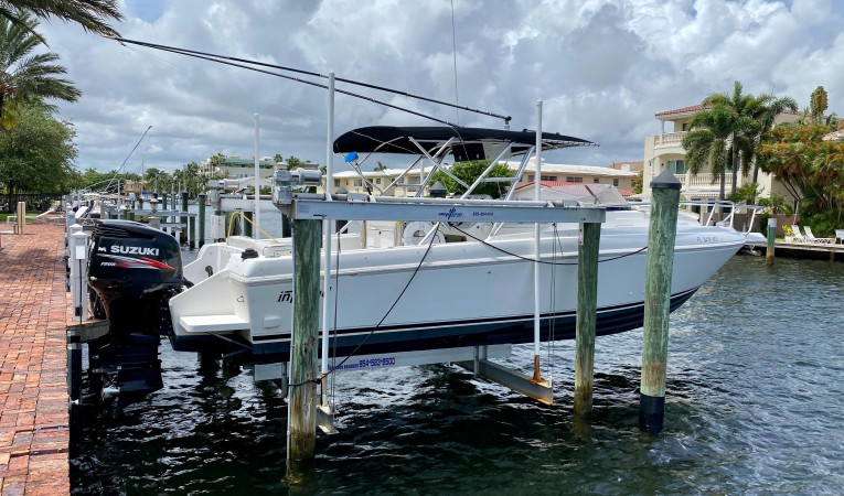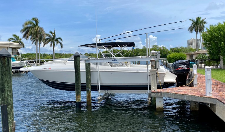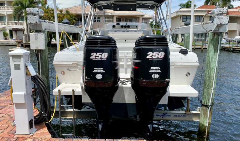 The Intrepid 339 is a semi-custom sport cruiser whose multipurpose layout is designed for fishing, diving, and entertaining. Like most Intrepid’s, the 339 rides on a high-performance stepped hull with a moderate beam and relatively low freeboard. With a variety of factory options to choose from, the cockpit of the 339 Walk around could easily be set up for serious fishing, and L-lounge seating forward of the helm offers extra seating for guests. Standard features include an integral bow pulpit, 35-gallon in-deck live well, in-deck fish boxes, trim tabs, dual dive platforms, rod holders, cockpit bolsters, raw water washdown, recessed rod storage, and four opening cabin ports. Below deck, the 339’s well-appointed cabin with wraparound seating, enclosed head/shower, mini-galley, and overhead rod storage sleeps two.