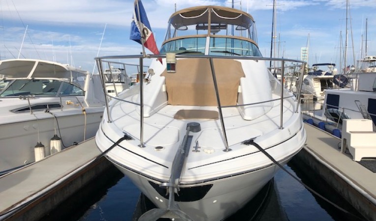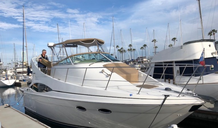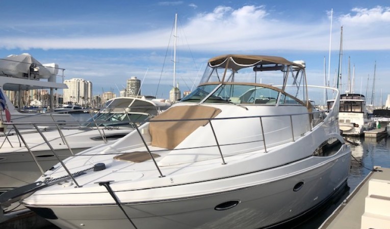 The Carver 350 Mariner's distinctive exterior styling and incredible single-level floor plan is one of Carver's all-time, most-popular yachts. The cabin offers a party-sized salon and sleeping accommodations for up to six. Two integral fiberglass stairways lead to the flybridge which provides seating for eleven. There's also a wet bar, port and starboard lounges and aft four-wide bench seat, plus a control console with full instrumentation and full wrap-around windshield. The 350's huge cockpit gives you plenty of room to enjoy all types of water sports and entertain your family and friends. The integrated transom platform includes a stowaway ladder.