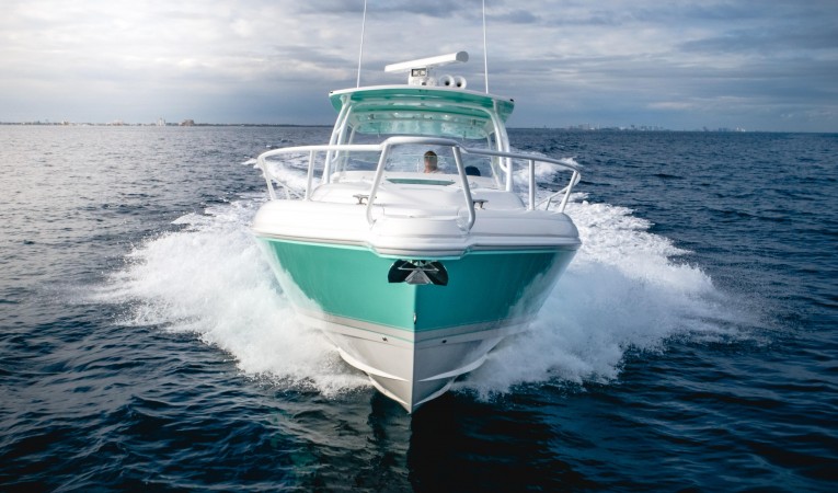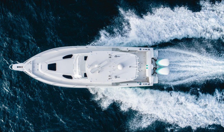 Twin 2-tone custom painted 350HP Yamaha 4-Strokes provide a 40mph cruise and top speed of 58mph.