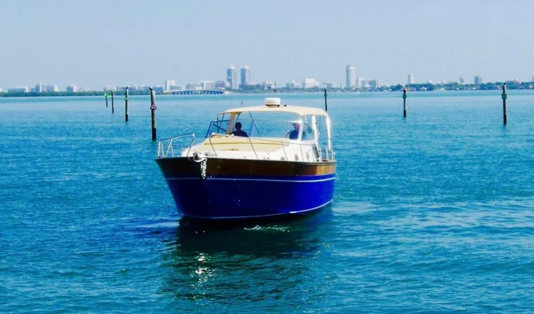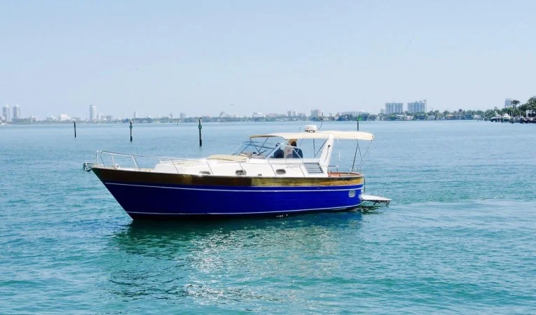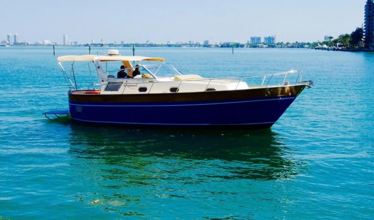 Classically styled Apreamare 11M Cabinato with low hour twin Volvo Penta diesel engines. Just went through an extensive refit. Including new paint job in stunning "Little Harbor Blue". She is ready for her next owner. Owner's plans have changed due to relocation. All offers will be considered. Easy to show in Downtown Miami's Sea Isle Marina.