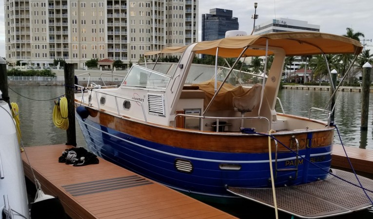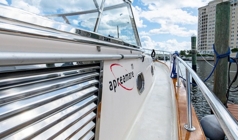 Italian Classic. 2019, engines serviced, bottom painted, cutlass bearings, shafts and props all serviced. New cockpit cushions, teak and interior A/C. The 11-meter Cabinato is a testament to Italian manufacturer Apreamare with Old-World styling. Nothing like her for those who want to stand out from the crowd.