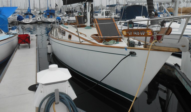 Sleeps up to six in V-berth, main salon, and aft cabin. Starting forward there is a V-berth stateroom with storage in drawers below the berth and shelves above. Next aft is the enclosed head on port with freshwater flush toilet. Opposite the head is a storage locker.