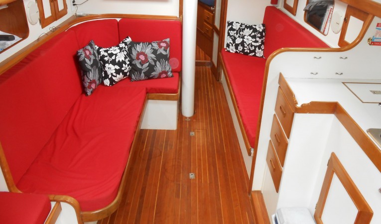 Next aft is the Main salon featuring port and starboard settees, with storage in lockers and shelves outboard of the settees. There is a salon table, currently in storage and not on the boat.
