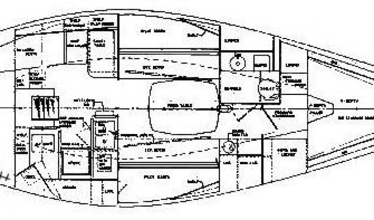 The main salon has bench settees on each side with pilot berths outboard. There is a fixed centerline table with drop leaves on each side. The salon is finished in varnished mahogany with ash trim and a light colored headliner. The salon settees slide out to make comfortable berths.