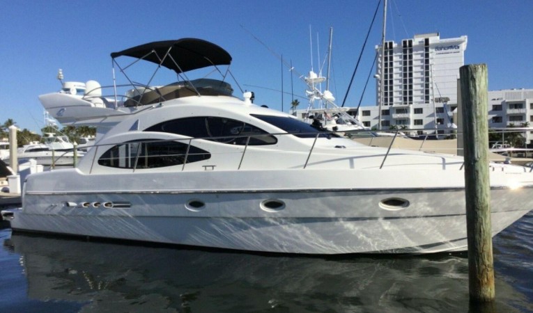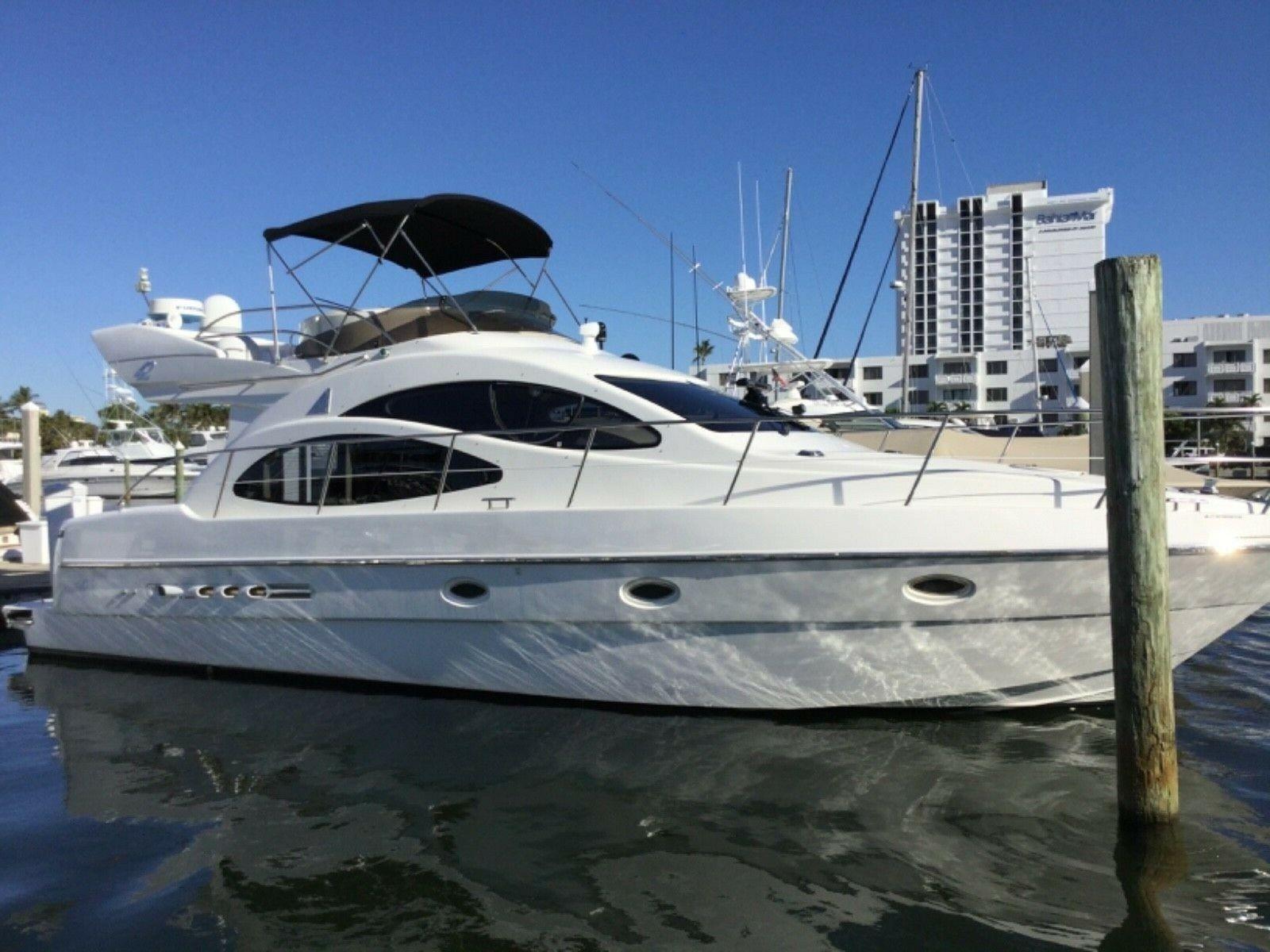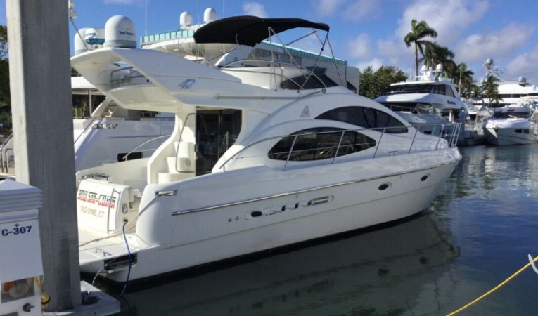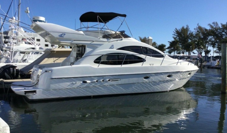 She is a sporty fly-bridge yacht with a 2 stateroom 2 head layout, that will turn heads wherever she goes. She has very good performance, cruising at about 28 knots and just over 32 knots when called upon. The roomy fly-bridge, cockpit, and salon areas make this boat tremendous for entertaining or just family fun.