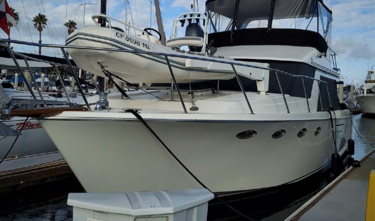 Designed by Ed Monk, the Ocean Alexander 42 Sedan is a high quality cruising boat. It has two staterooms, a single head, and an inside helm. Outside is a spacious cockpit & flybridge.
