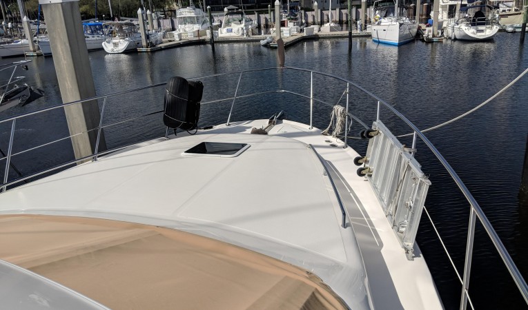 Exterior space is just as abundant, with a large table and seating area on the aft deck that includes a full-service wet-bar with sink, ice maker and multiple storage compartments. Just a couple steps forward lead to a comfortable open helm area with dual captain’s chairs and lounge seating for guests. The forward deck is easily accessible from either side from the aft deck with high safety rails and wide walk around deck.