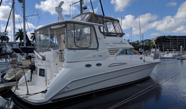 The Sea Ray 420 aft Cabin Motor Yacht is perfect for the couple who is looking for a spacious live aboard or to cruise the great loop. Her expansive floor plan includes a full beam master stateroom to aft, and generous forward VIP Stateroom separated by a generous salon, and full-featured galley with a convenient utility room off to port, with two full-size heads and large shower stalls to accommodate extended stays.