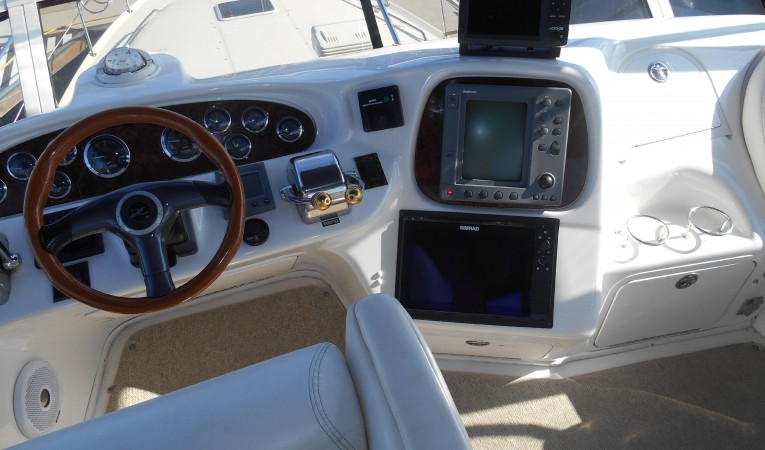 The aft sun deck is an ideal place for entertaining and relaxing with family and guests. The sun deck is open and light and features a wet bar with sink, storage and ice maker. Just up a few steps from the sun deck is the spacious fly-bridge with a panoramic view for safely navigating the vessel with ample room for family and guest to enjoy a great day on the water.