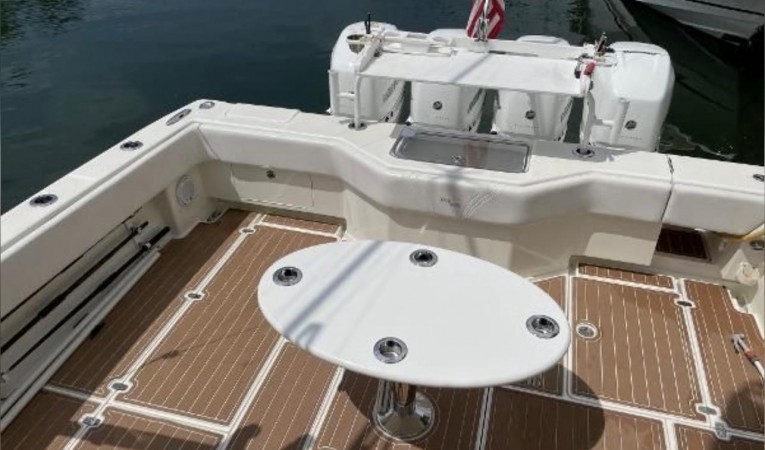 She completed a complete refit in 2018 including FOUR NEW Mercury Verado 350hp outboard engines, new windshield, new Eisenglass, new generator, new electronics, new touchscreen stereo & speakers, new carbon fiber dash, new SeaDek, and new cushions (exterior). The boat is meticulously maintained, including air-conditioning, refrigeration, water maker, ice maker, and 300-hour service on Mercury engines and fresh ceramic polish and coating, all services completed in January 2022.