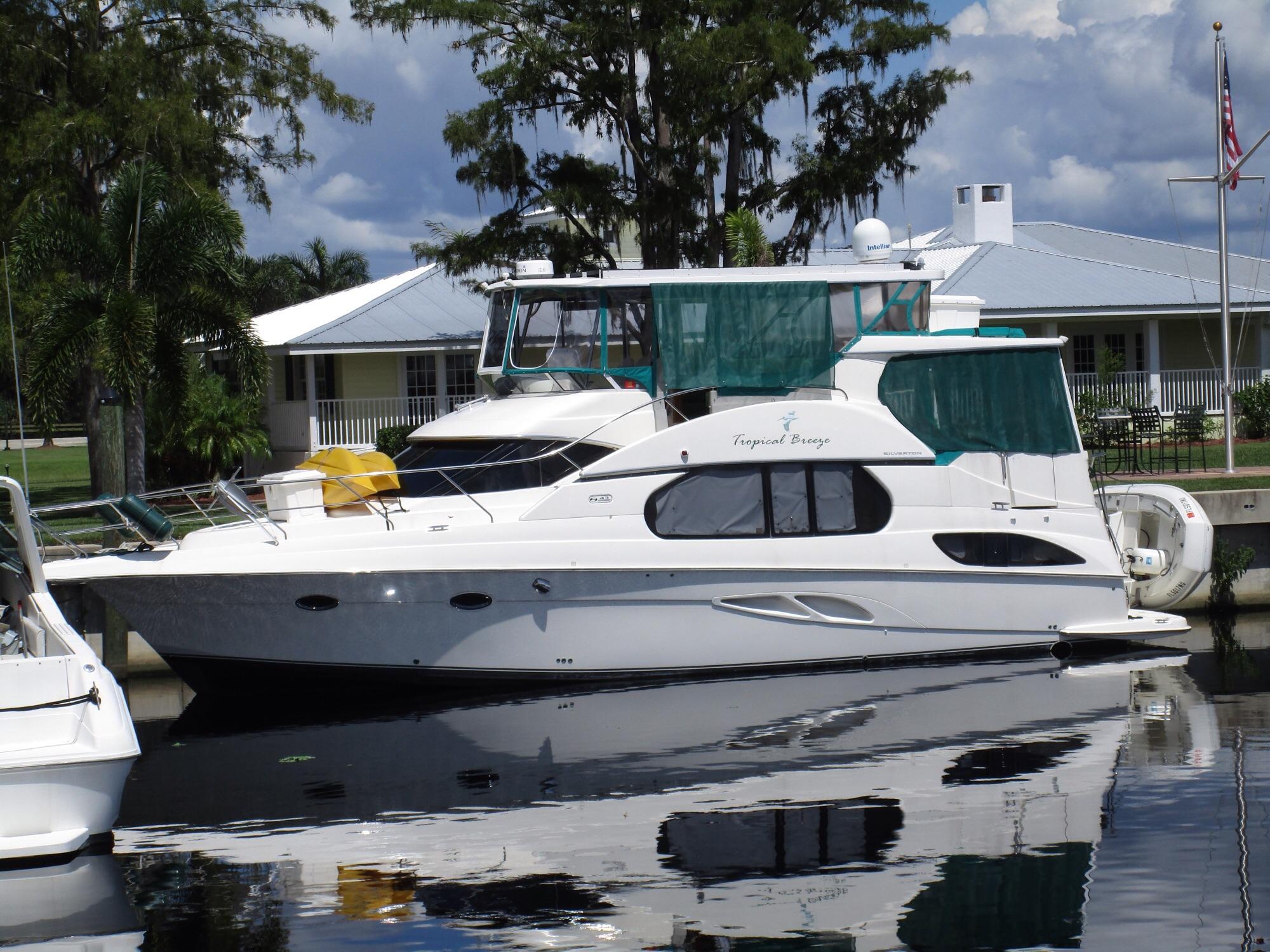 Elegance and spaciousness are what the Silverton 43 Motor Yacht is all about. A sleeker, lower exterior design reduces windage and enhances performance while still incorporating the trademark Silverton SideWalk. These molded steps provide quick and safe passage to the foredeck and allow the salon to reach full-width from gunnel to gunnel. An enlarged flybridge includes an expertly laid out helm with room for all the latest in electronics, plus a large seating area with loads of storage. Entertaining or relaxing is easy on the covered aft deck which comes complete with wetbar and fiberglass weather boards. Beautifully crafted cherry wood is in abundance throughout the well thought-out interior. A grand salon features a large and comfortable settee while the equally large dinette provides additional seating and storage. A standard 27-inch television is strategically located up above for all to view. The expansive, Corian-covered galley is complete with top-of-the-line appliances and plenty of storage. Even a pullout pantry is included. Both staterooms enjoy queen-size, innerspring mattresses and a multitude of storage and hanging lockers. The split head and shower arrangement both fore and aft allow for great flexibility for the owners and guests.